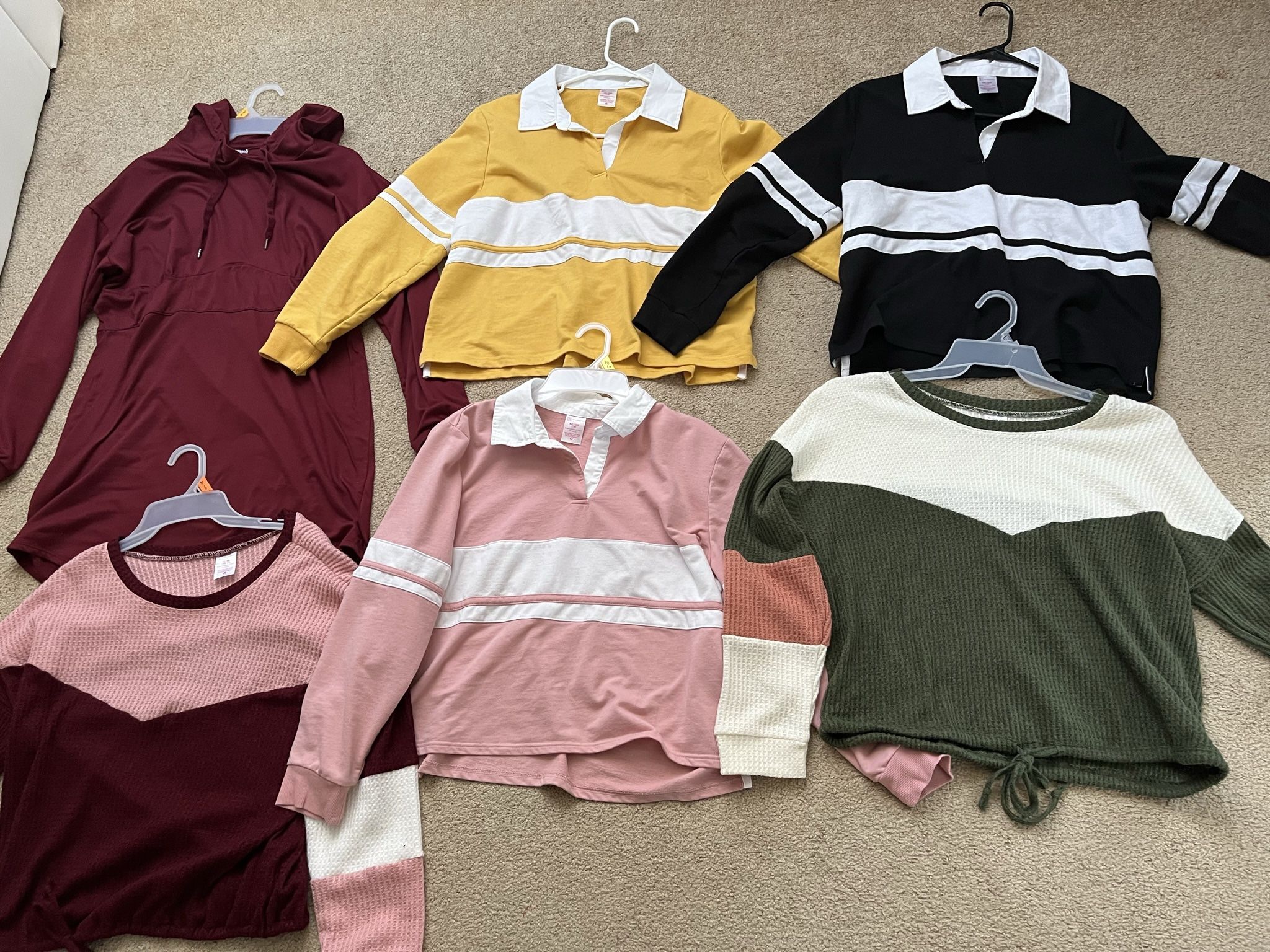 Used once like new $7 each or $40 for all Green&white L Purple dress and purple and pink top XL Pink, yellow and black XXL