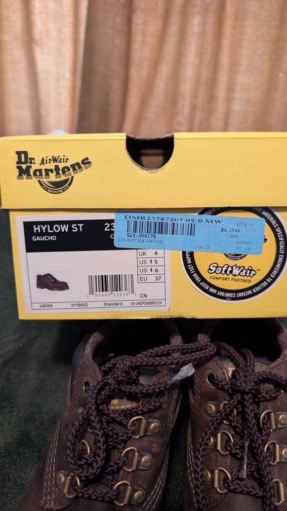 Only worn a few times, they are just a lil dirty not worn at all. They are steel toe, industrial shoes. Size 5 men, they fit me perfectly and I'm a 7 woman's. I paid over $140+ and wore 3 times