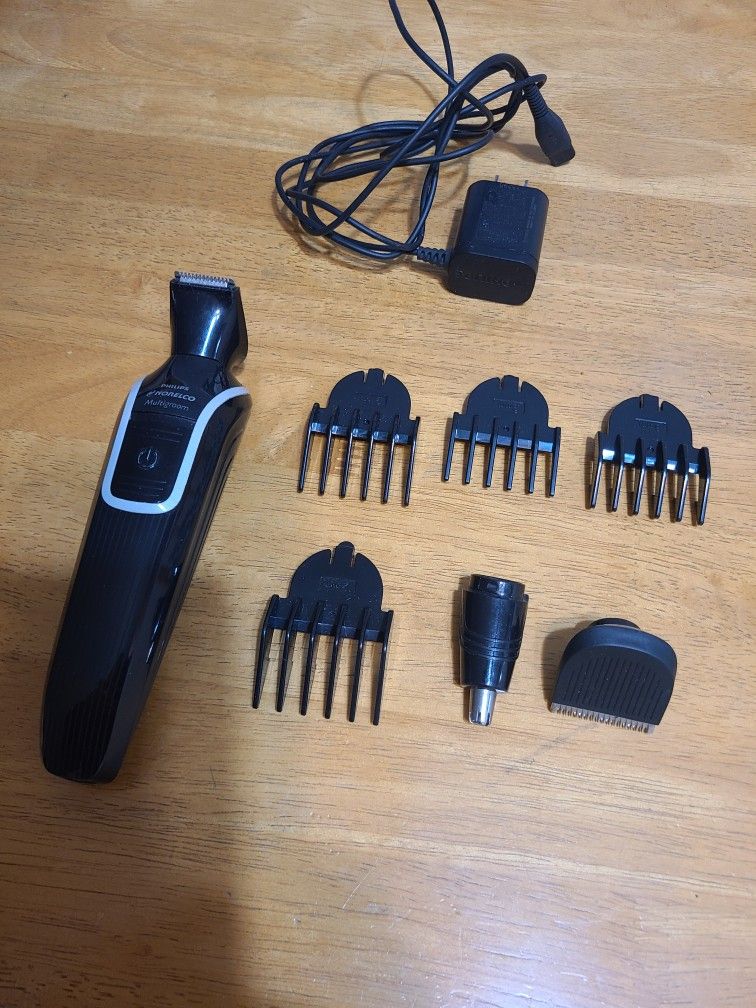 Philips Norelco beard trimmer. Includes charger, three trimming heads and four clip-on trim extensions. In great working condition.