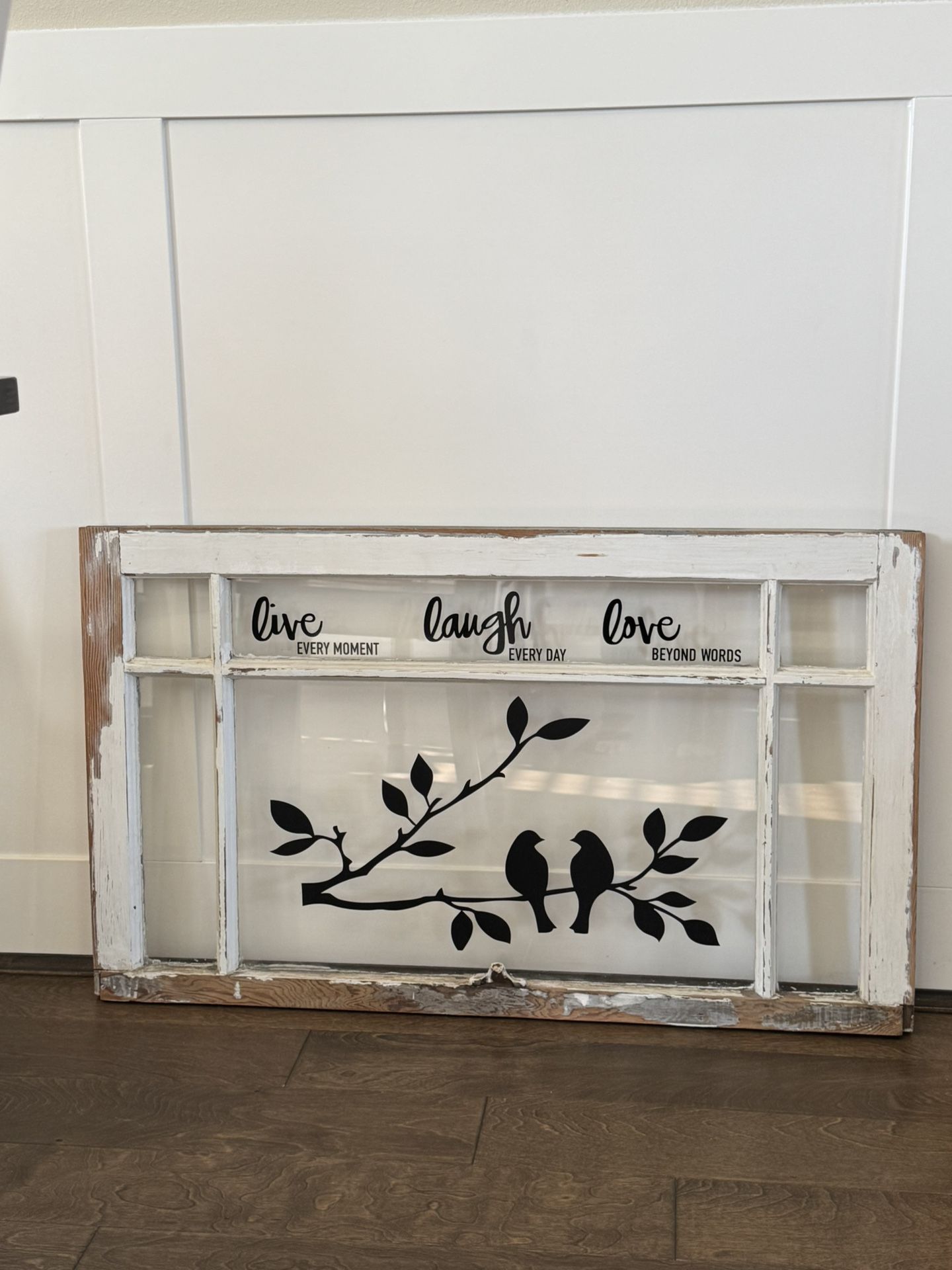 Beautiful 6-pane architectural salvage window upcycled into a piece of wall art. Size: Large 36" x 20" Design: Features "Live every moment, Laugh every day, Love beyond words" lettering with a bird on a silhouette branch. Style: Authentic vintage wood frame with weathered white paint. Ready to Hang: Includes heavy-duty hanging wire already installed on the back for easy mounting. Condition: Great vintage condition with natural distressing that adds character. Glass is clean and intact.