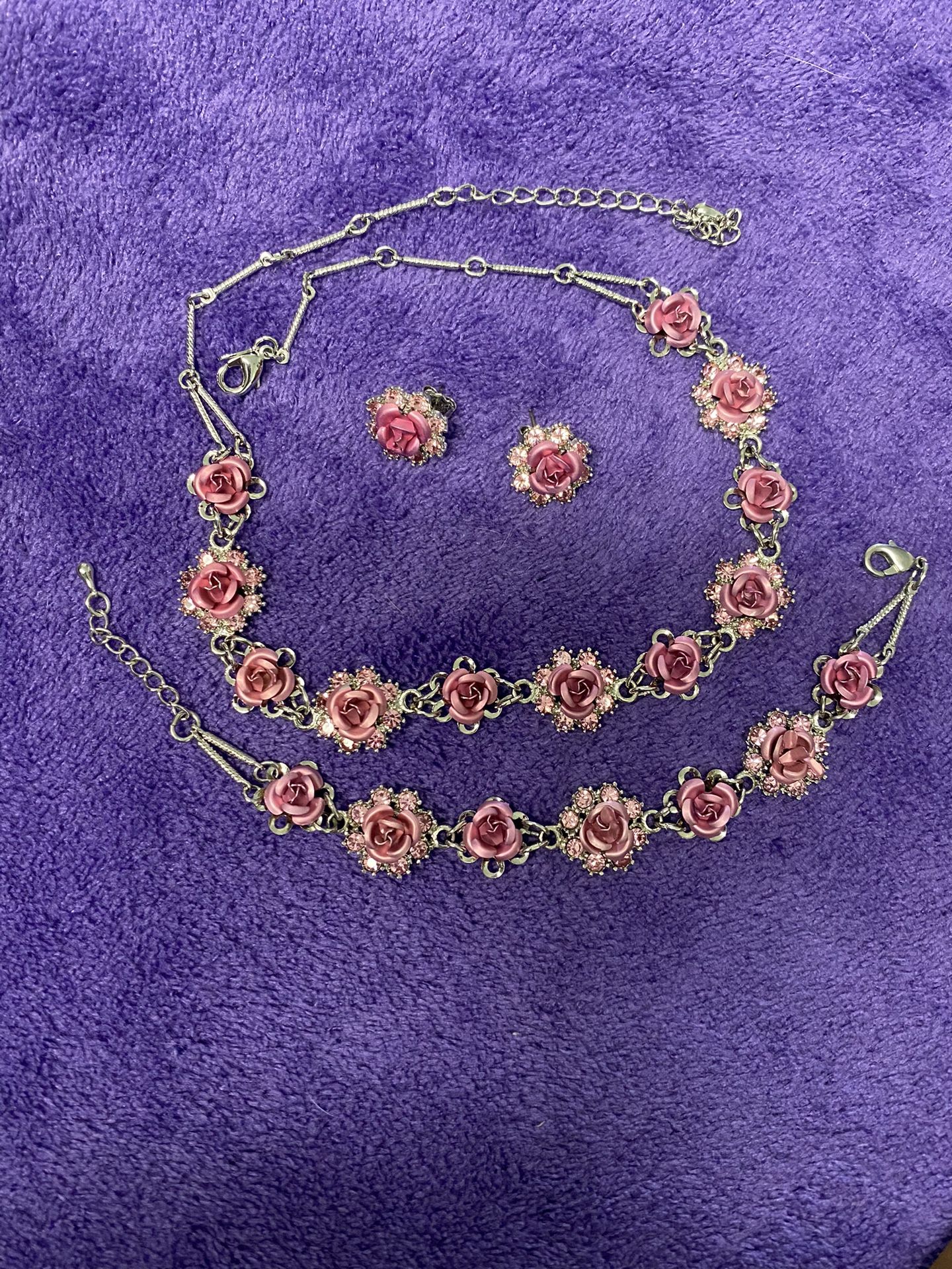 necklace, bracelet and earrings set  roses and rhinestones Never worn-excellent condition