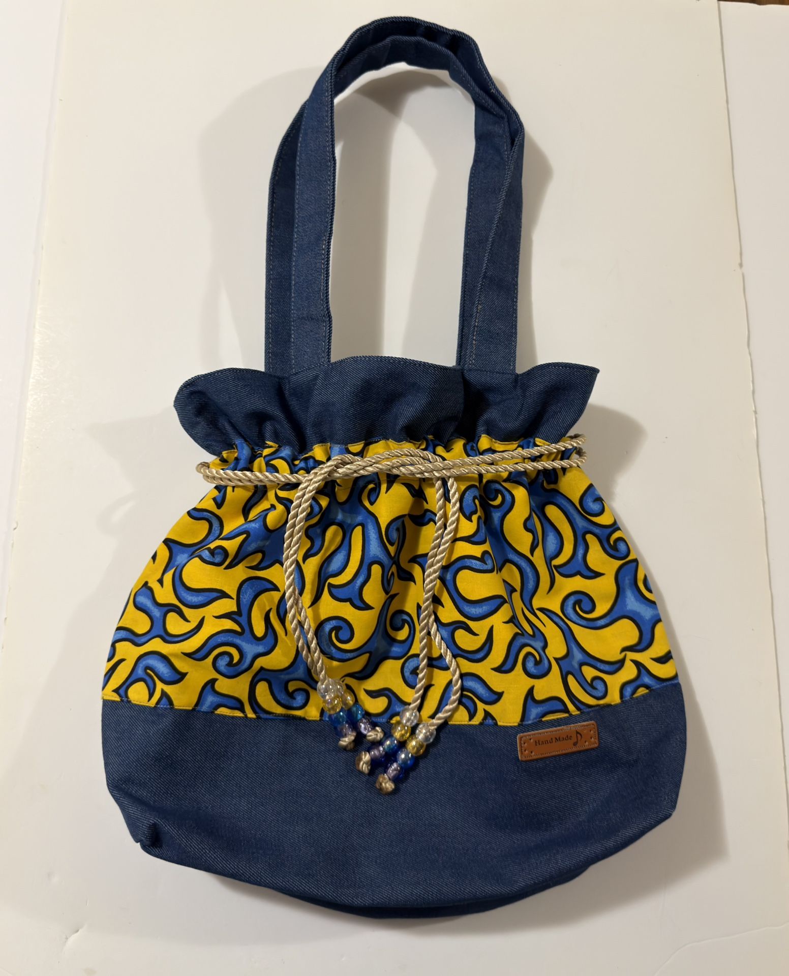 Denim Blue With Yellow and Blue Print Medium 16X18 Drawstring Tote Bag