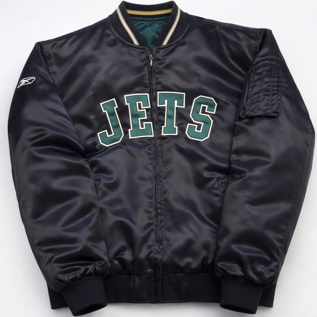 • Brand: Reebok • League: NFL • Team: New York Jets • Style: Satin Bomber Jacket (sometimes called a varsity bomber) • Closure: Full-zip front • Material: Polyester satin • Era: typically late 1990s – early 2O00’s