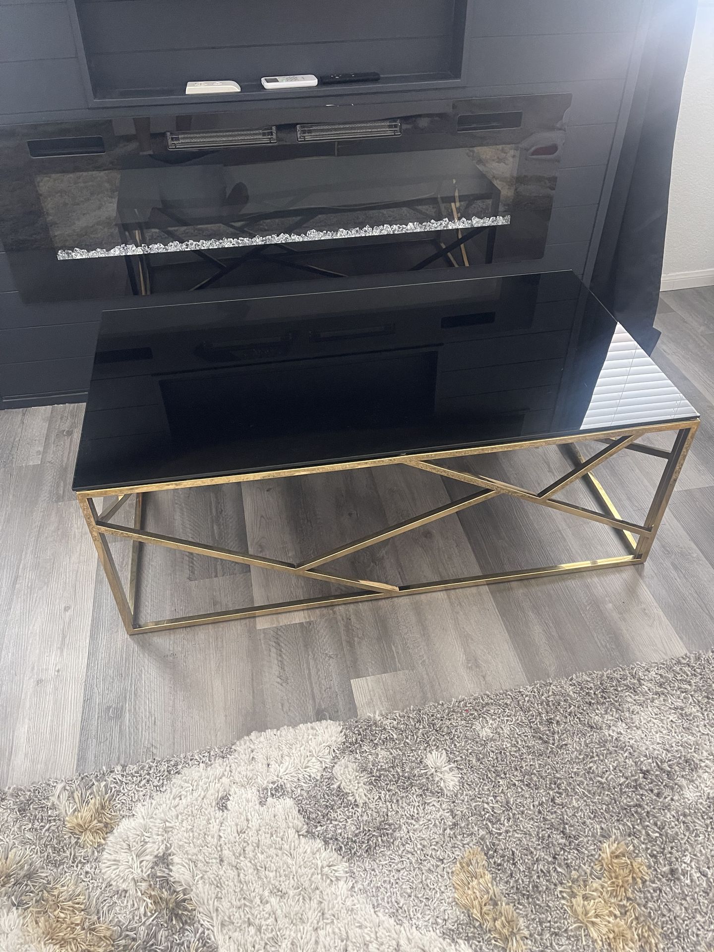Good condition Contemporary Rectangular Coffee Accent Table Featuring a Black Tempered Glass Surface And a Stainless Steel gold Frame 48”W 26”D 17.5”H
