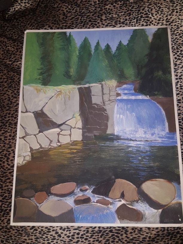 Another one of a kind, original piece -acrylic painting of a waterfall within a forest area. 18"x14" (My boyfriend again happens to be the artist of this one).