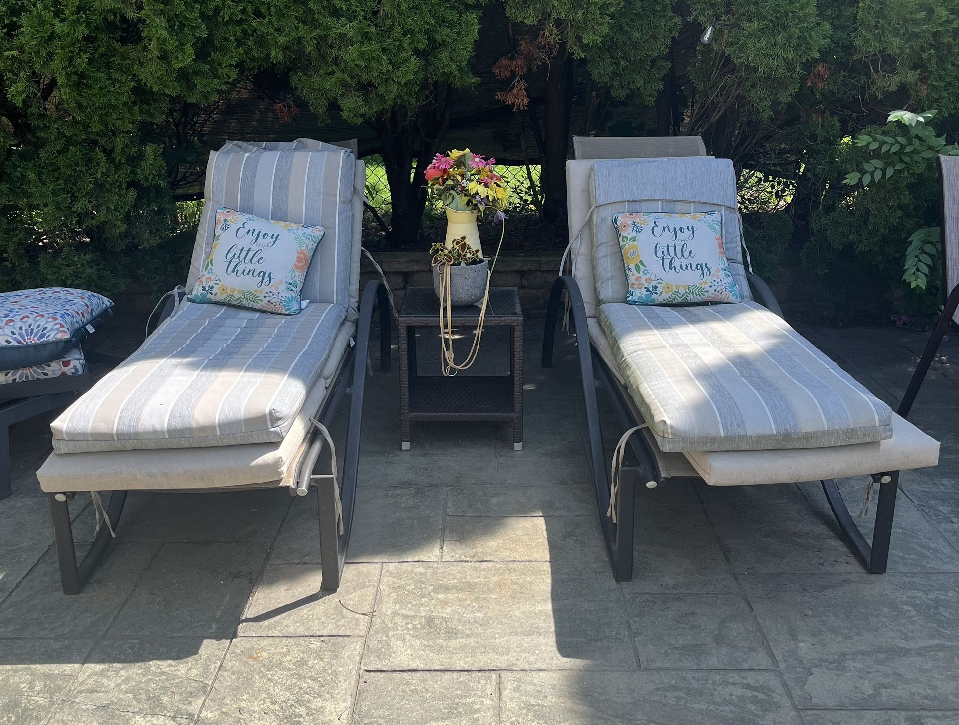 Two Chaise Lawn Chairs that have multiple settings with cushions. They go all the way back for tanning and really good shape.