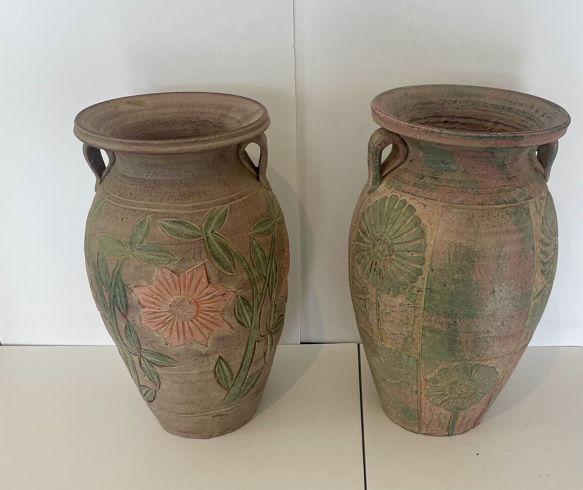 Pair Of Large Vintage Terracotta Floral Motif Urn Floor Vases