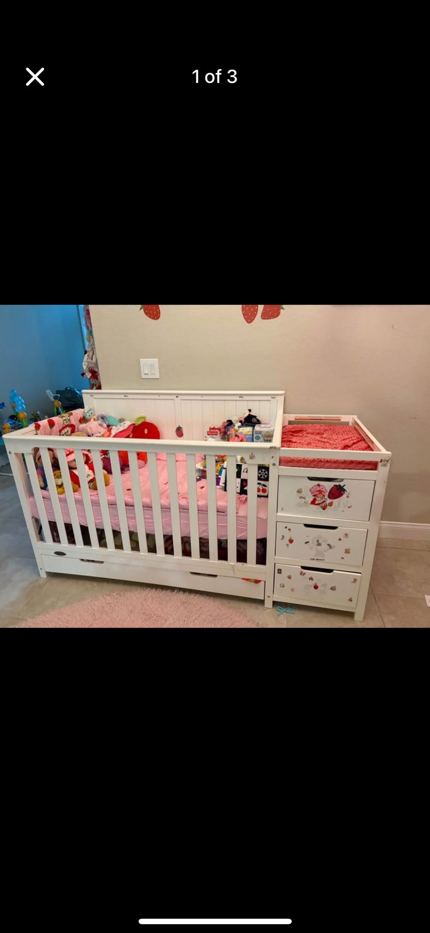 Don’t include mattress need gone now asap I need the space to put a playpen with a mat for my daughter stickers can come off has a couple scuffs here and there has big drawer on bottom and 3 on side and back side has two shelves it’s kinda broke idk how to fix it probably easy it looks like tho. Come and get
