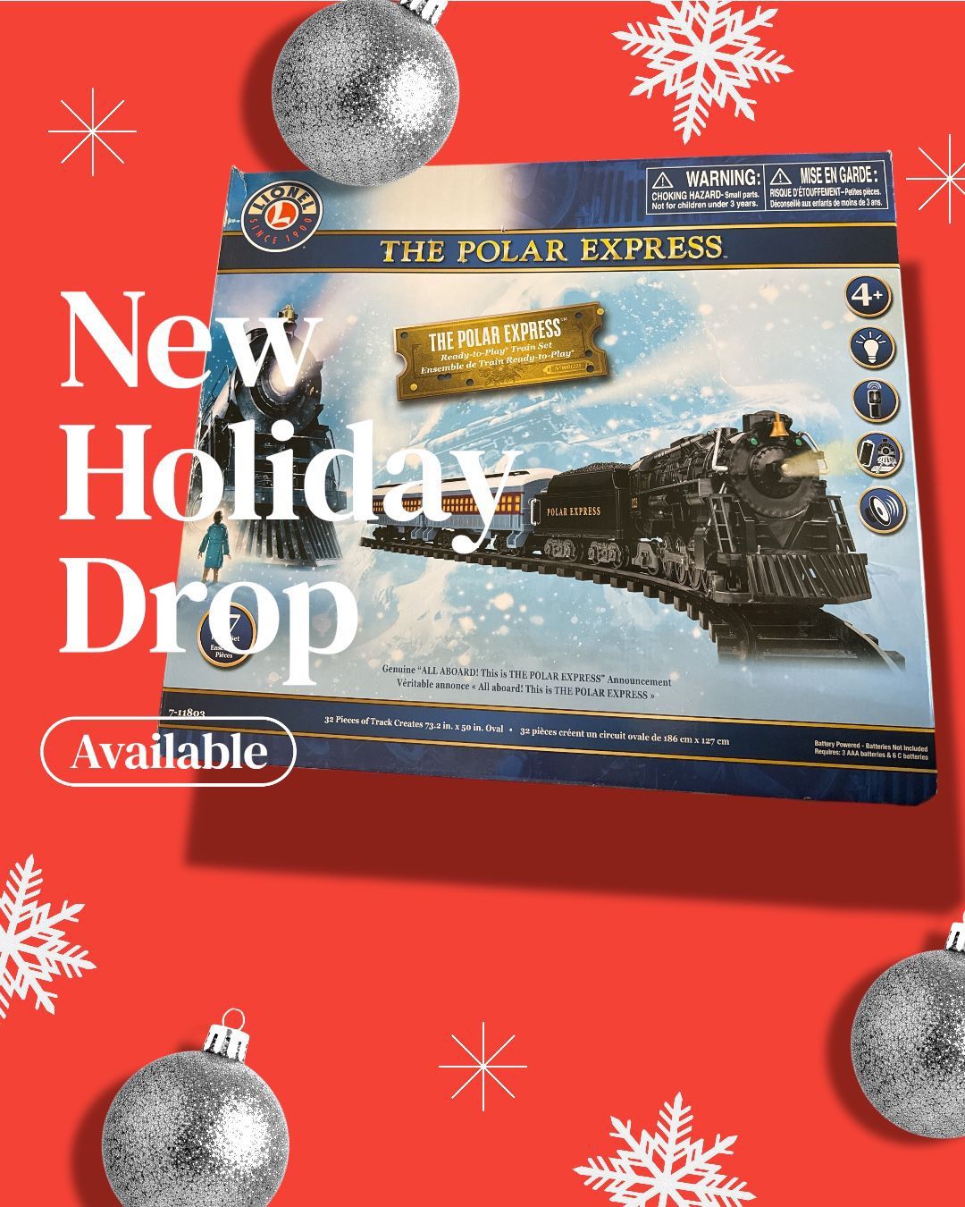 Lionel The Polar Express Ready-to-Play Train Set (SKU 7-11803). This G-gauge, battery-powered model train set is a popular Christmas-themed toy for children aged 4 and up.