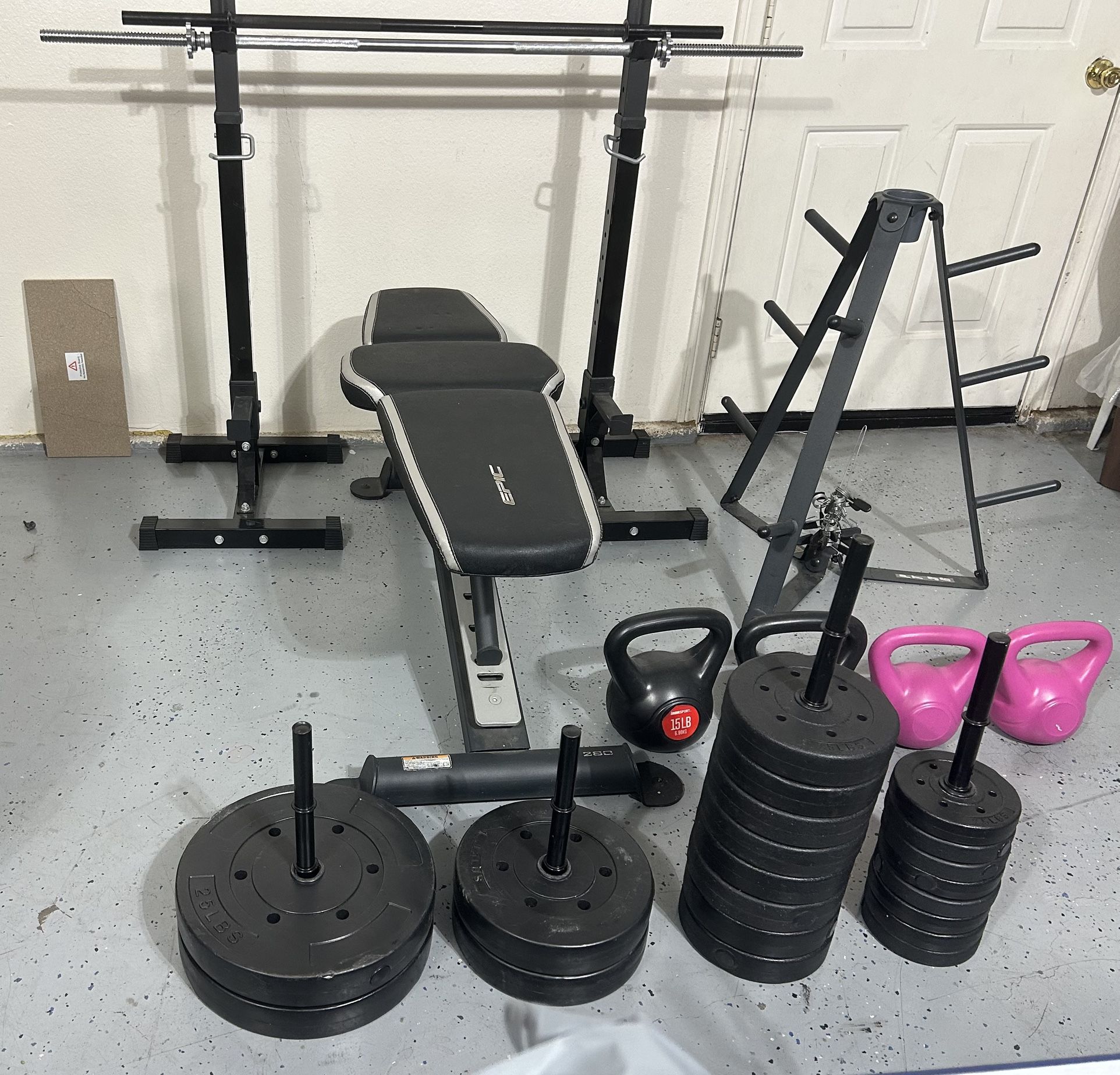 2X25Lbs, 2X15Lbs, 8X7.5Lbs, 8X2.5Lbs weights, 2X15Lbs kettlebell, 2X5Lbs kettlebell, 25Lbs bar, 2.5Lbs bar, weight rack, 4 curl bars, 1x Bench, 2X bar stands, 10+ bar clips. !OBO!