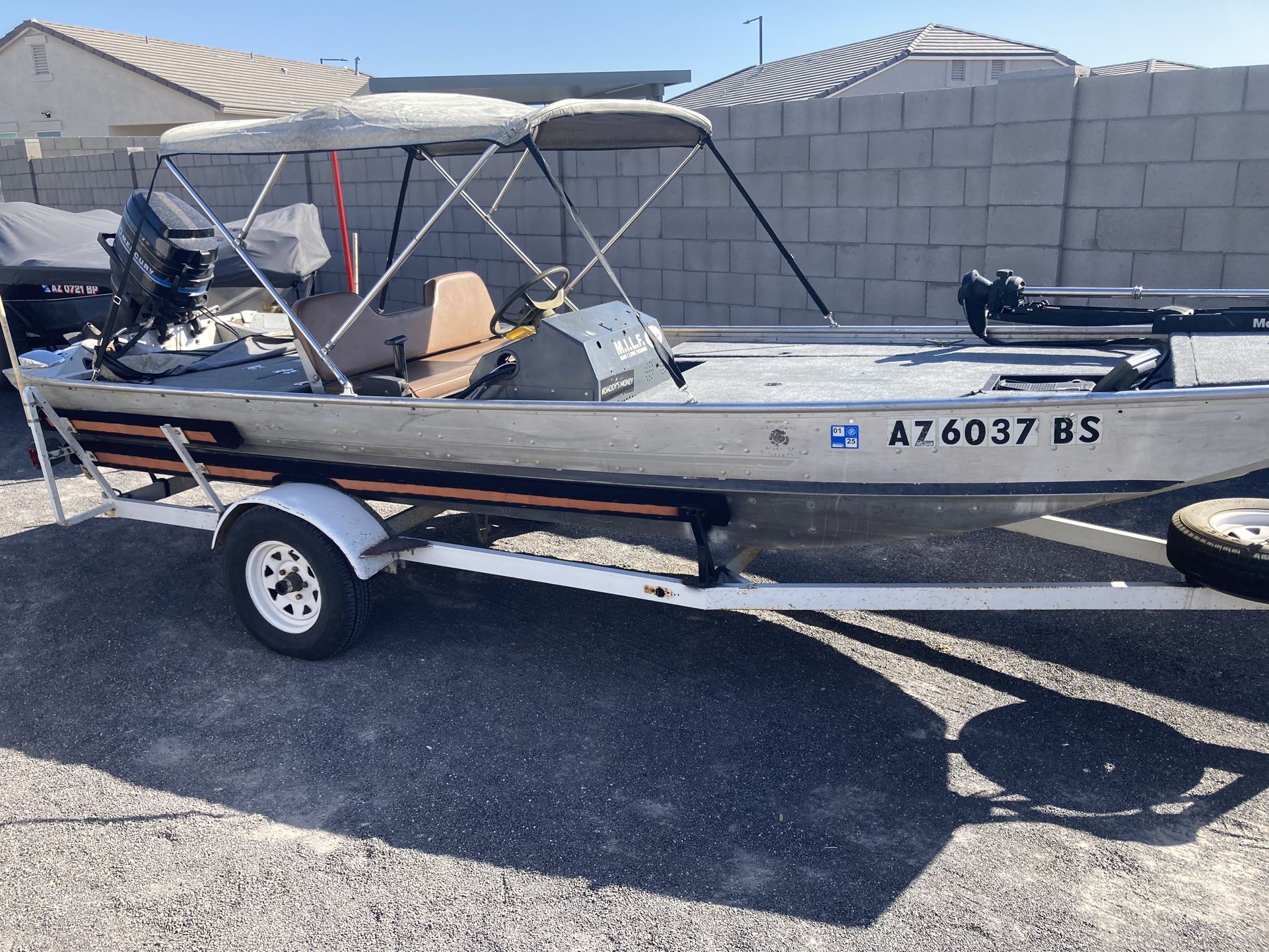 1982 bass tracker with 50hp mercury, new carpet up front, lowrance fish finder, motor guide trolling motor, 12gal fuel tank, Bimini top, cover, seats for the front and back decks. Dry boat. Trailer tires still good. New bunks on trailler, bottoms not installed yet but i have them with hardware. $2000 obo
