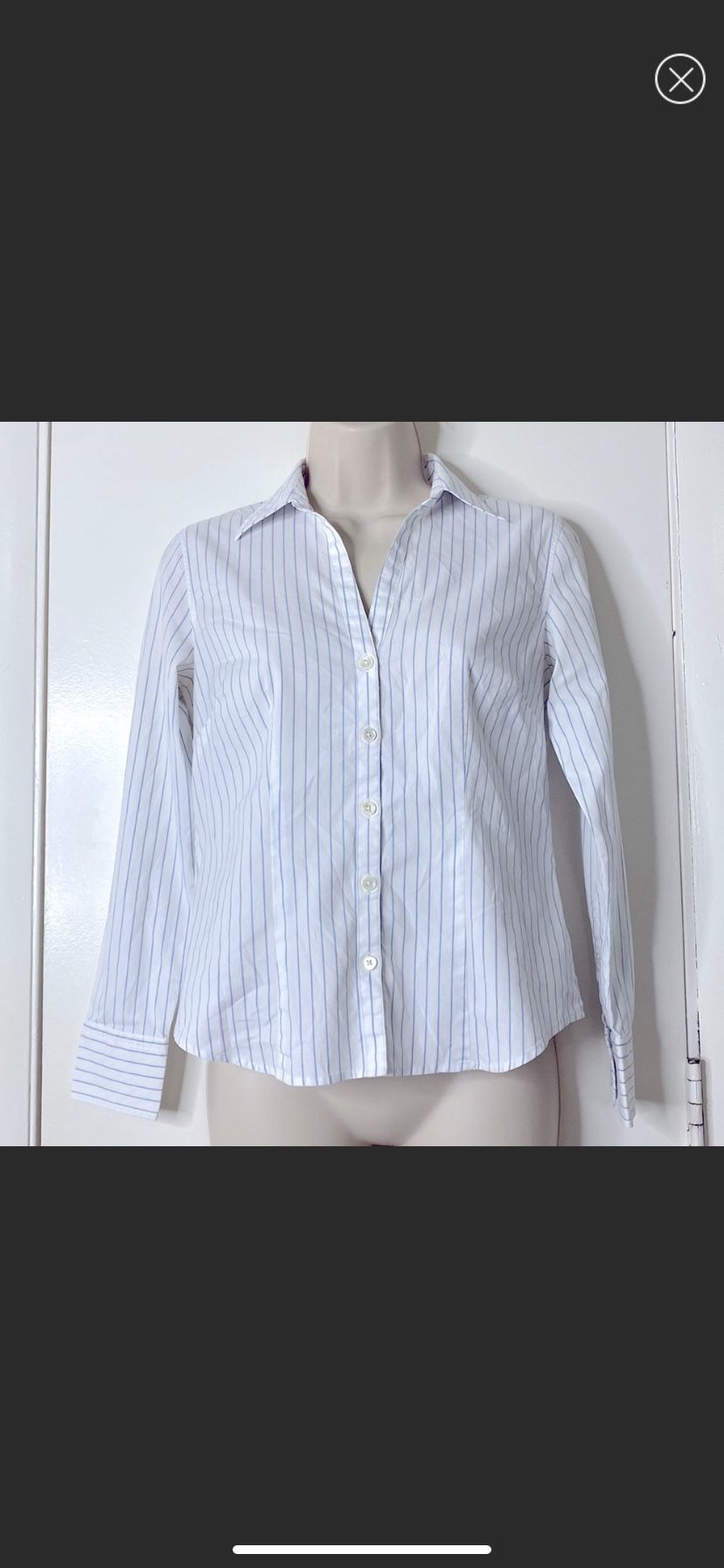 All orders ship 1-3 business days! Striped button top women Conditions: clean condition/good condition/No holes/ No fade The color is stripes white and soft blue Size 4P petites Measurements are approximate Details: has front buttons Outfit ideas: good for work or for formal wear Smoke free home!