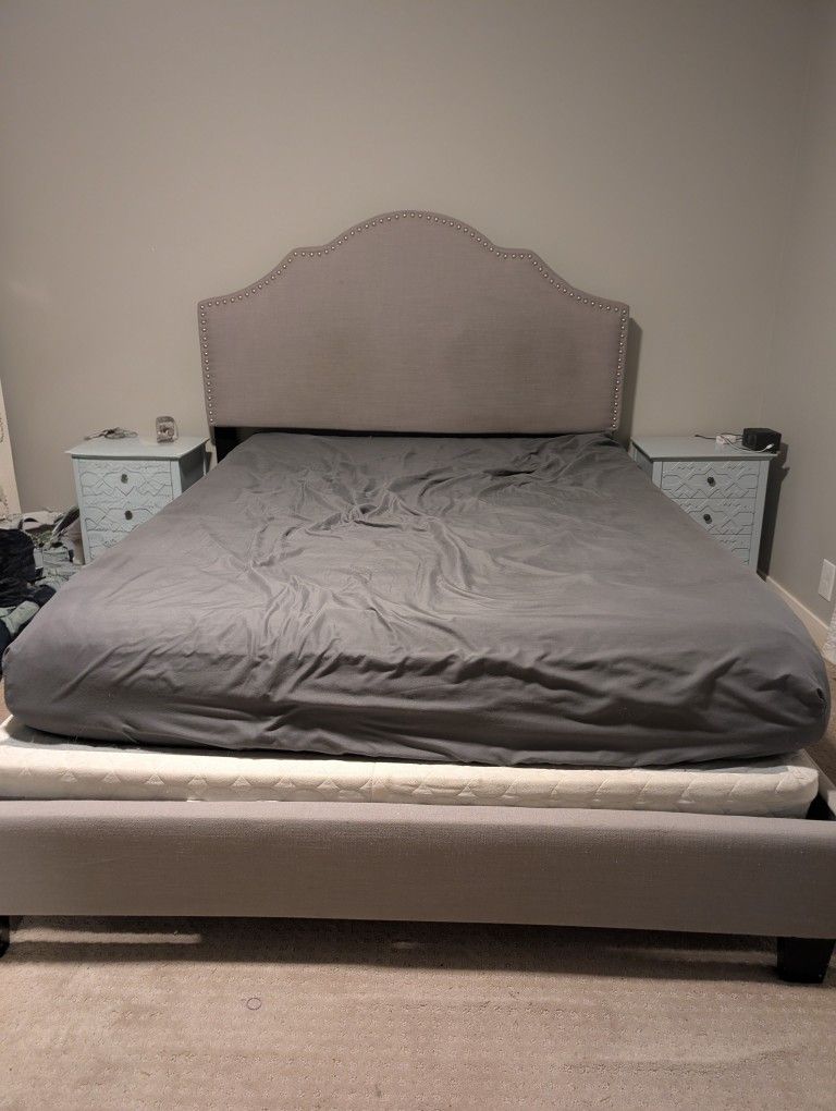 Queen bed frame only Probably needs some cleaning has some sort and grim on it particular right side of headboard Material has some pilling on it