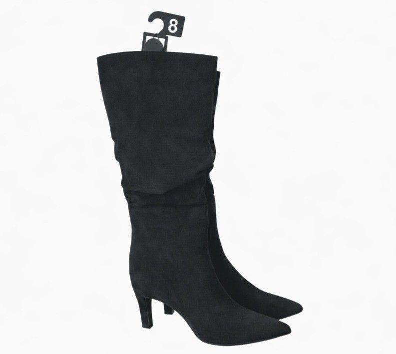 Black Ruched Faux Suede Mid-Calf Stiletto Bootie Pointed Toe Zip Casual size 8