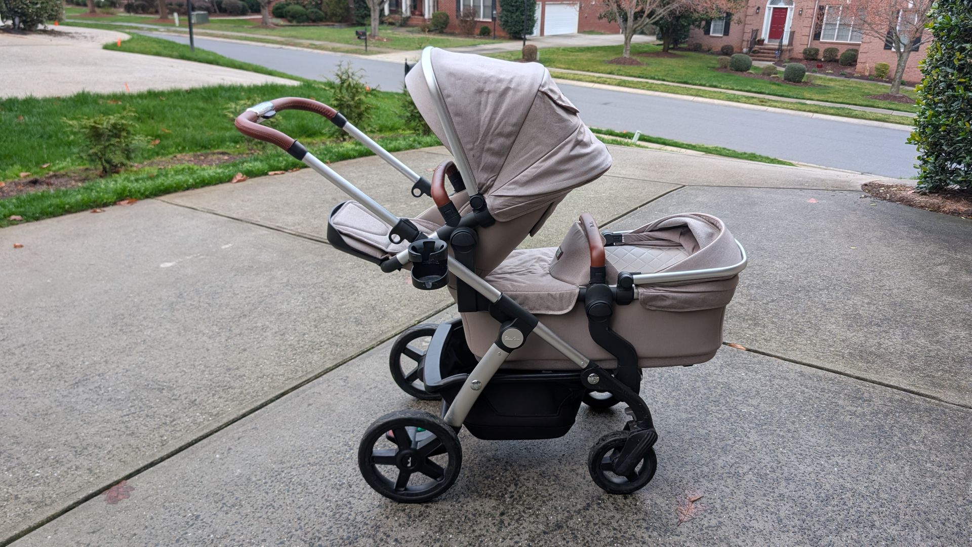 Silver Cross Wave Double Stroller System. This is a luxury / high end stroller system from England with heavy duty frame to smoothly ride on all types of terrain. Comes with all needed accessories including cup holder, mosquito cover (one for seat, one for bassinet), rain cover (one for seat, one for bassinet), car seat adapters to mount compatible car seat (we used Nuna), tandem adapters to use both stroller seat and bassinet simultaneously. The brand new one retails for $1699.99.