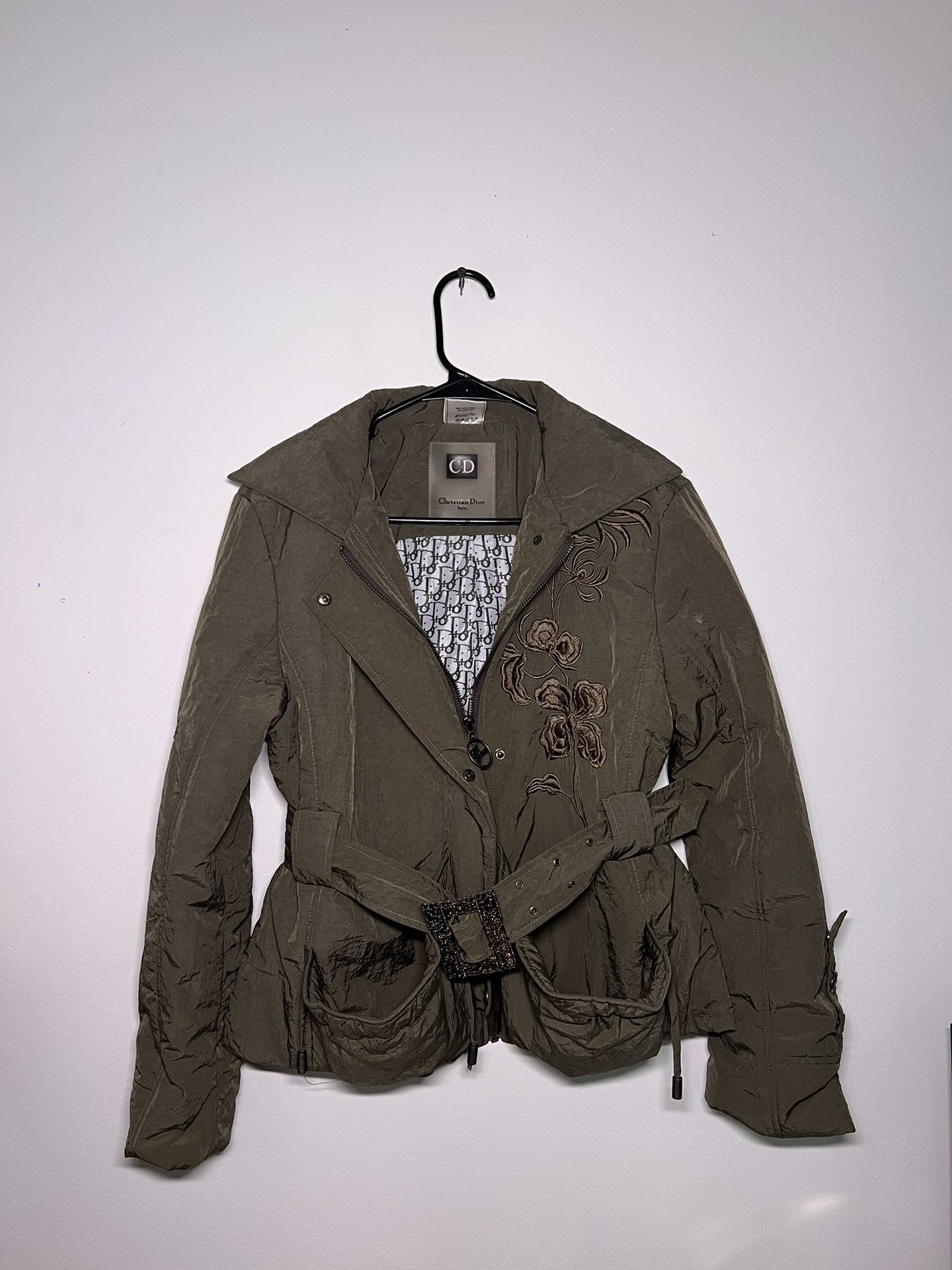 Christian Dior khaki y2k vintage jacket with belt and monogram inside, polyester on the outside cotton inside, has very interesting reflective colour, posted in video, fits like women’s S- Medium. Ideal condition - like new