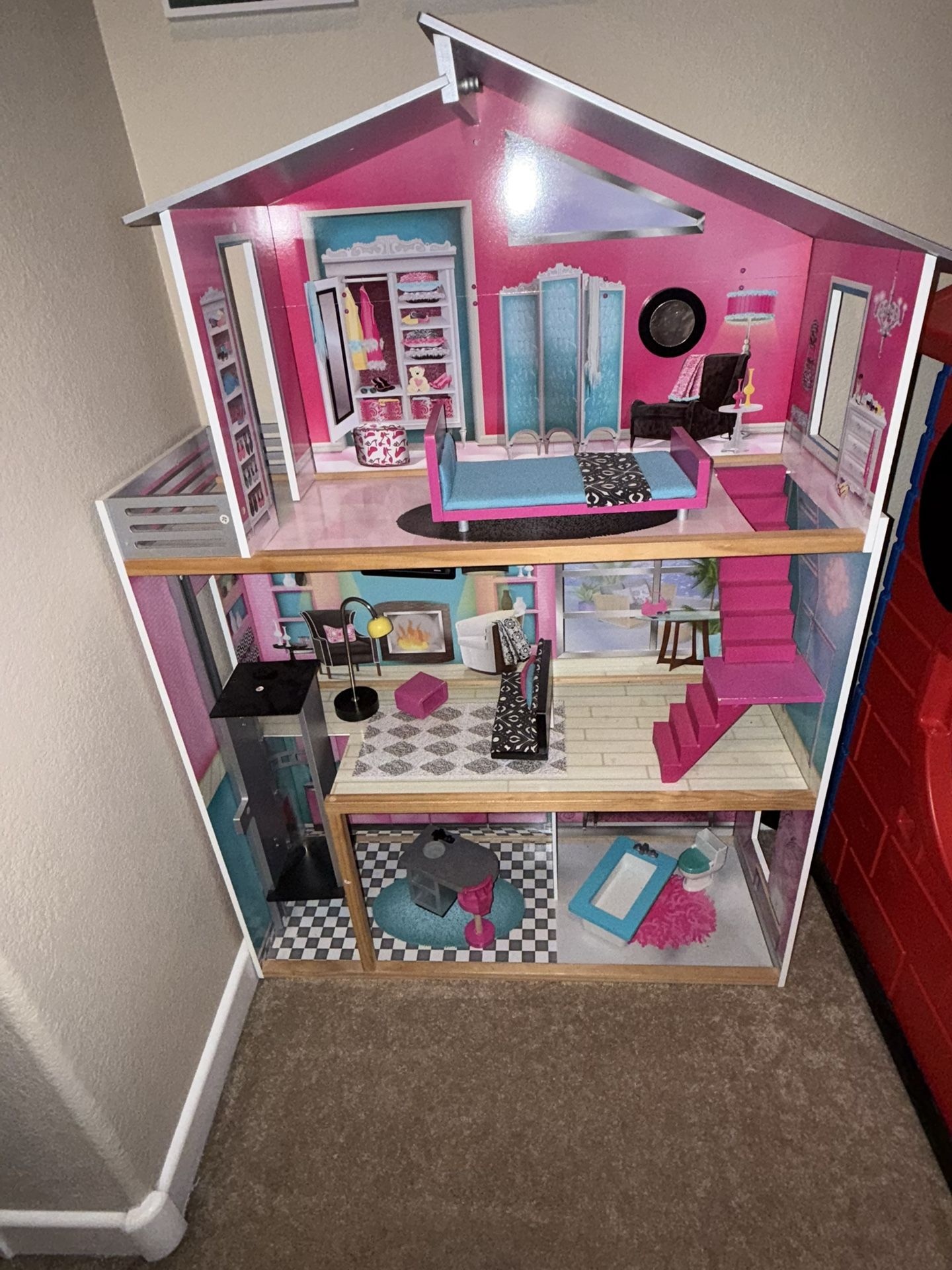 3 story doll house with accessories. My daughter grew out of it. It's time for a new home. Great shape. One flaw is the skew when tightening the elevator.