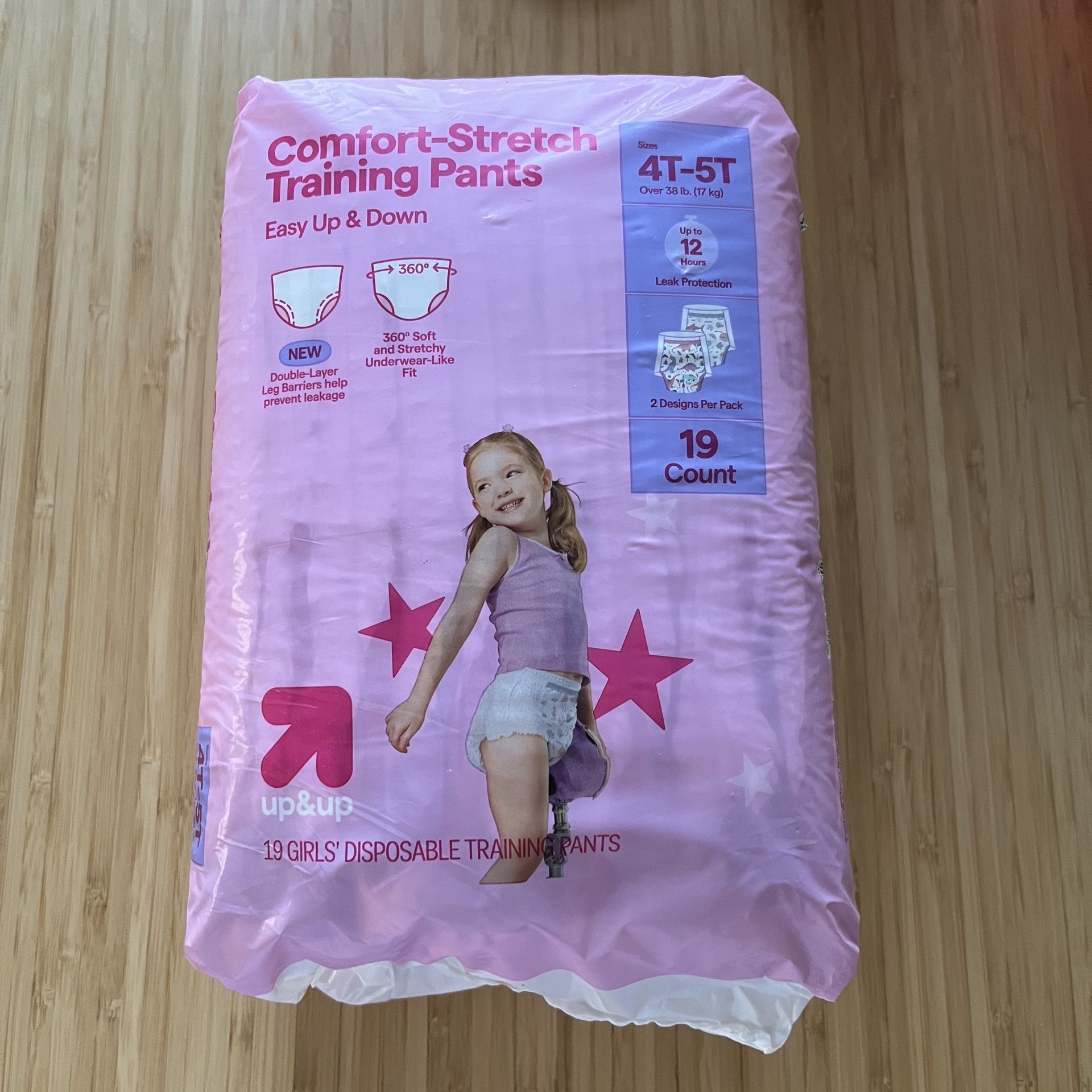 B rand new, unopened package of Up&Up Comfort-Stretch Training Pants for girls. They are size 4T-5T and the package contains 19 disposable training pants. These pants feature double-layer leg barriers to help prevent leakage and offer up to 12 hours of leak protection. They also have a 360° soft and stretchy underwear-like fit.