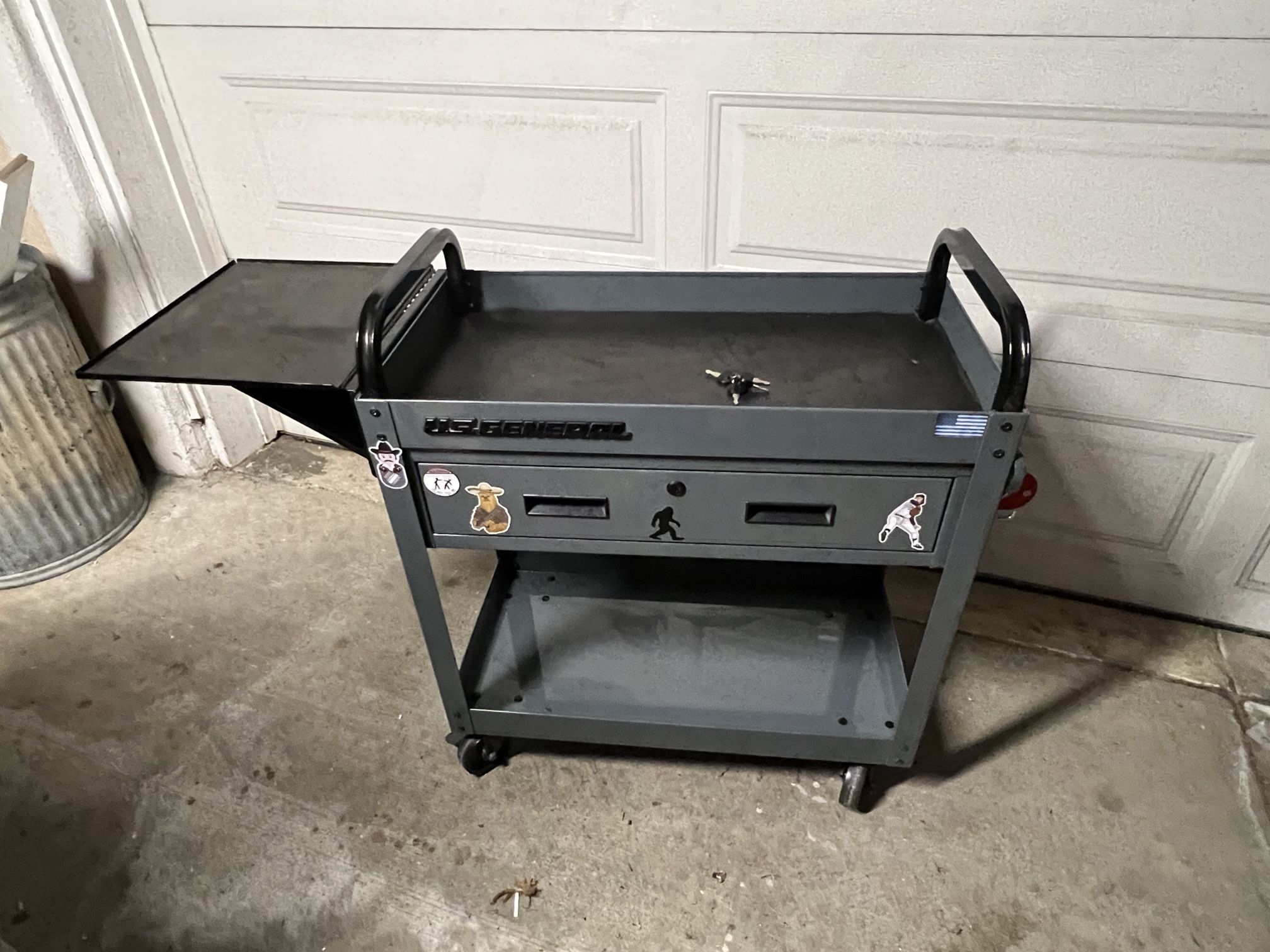U.S. GENERAL 30 in. Service Cart with Drawer. Used in great condition. Added shelf that can be folded down when not needed. Also included are 2 magnets hooks, paper towel holder and a couple wrench sets pictured. PRICE IS FIRM.