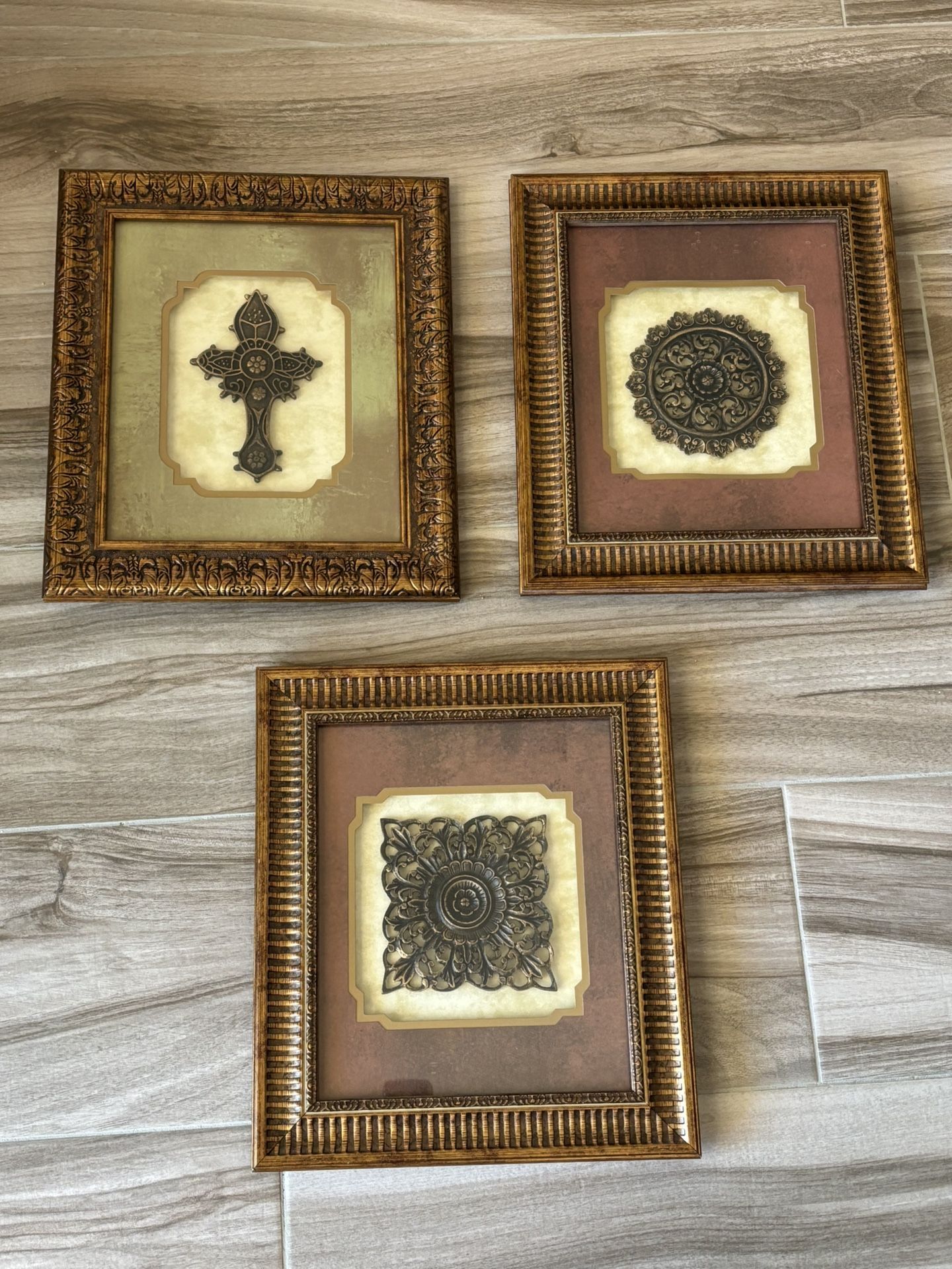 This is a set of three framed 3D mixed media wall art pieces with a gold bronze finish. The set includes one cross design and two medallion designs. Measures about 15.5”x14”. Cash only.