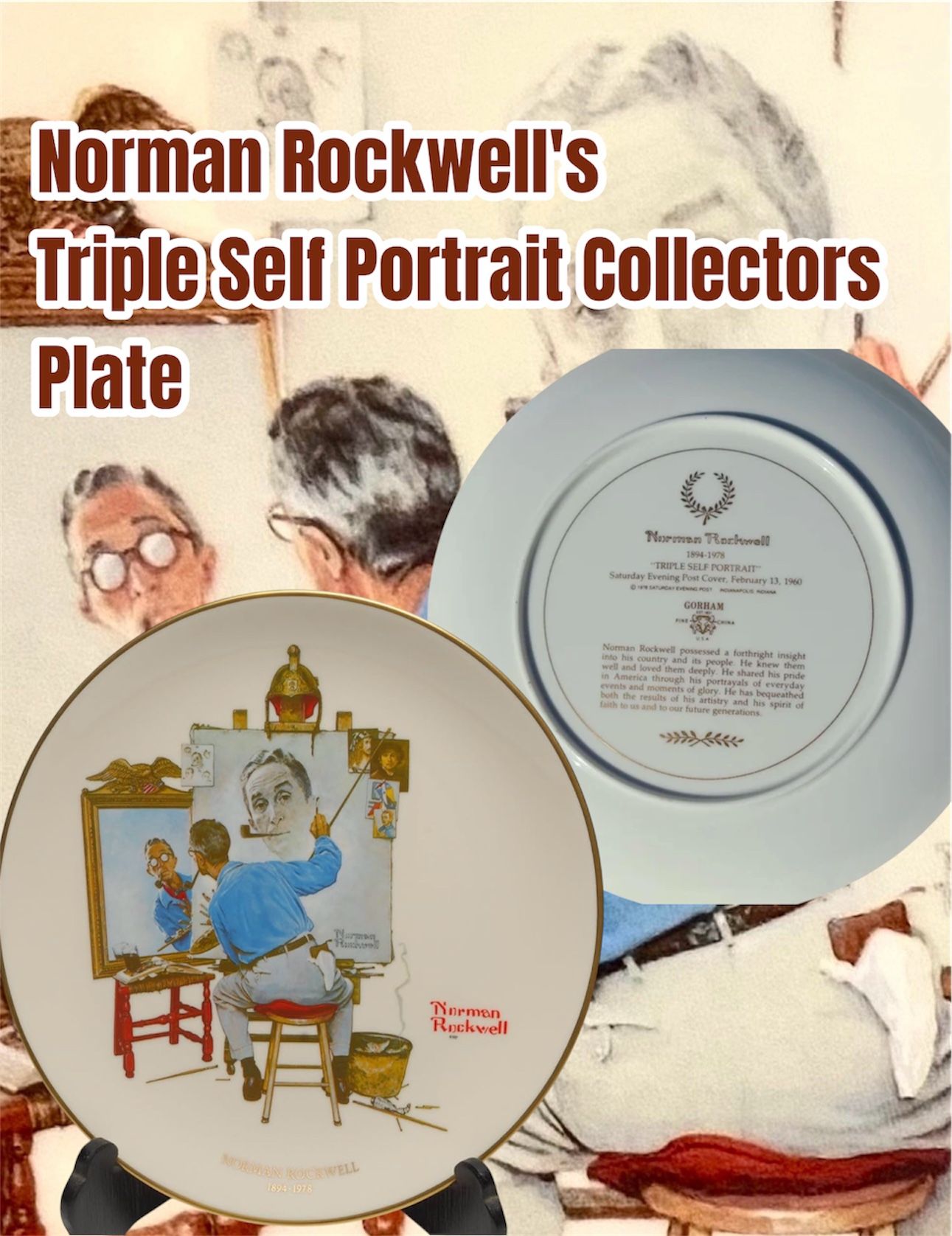 VINTAGE Norman Rockwell 1979-LIMITED EDITION Fine China plate: "TRIPLE SELF PORTRAIT" 11" in diameter This vintage Gorham 11" collector plate features a triple self-portrait of Norman Rockwell, crafted in fine porcelain with a round shape and a white color. The plate is a perfect addition to any collection, suitable for all occasions and with a decorative style that will add charm to any room. Made in China in the late 20th century, this plate is a true gem for collectors of antique and vintage items. The plate is not handmade and has a brand of Gorham. It is categorized as a collector plate, perfect for those who appreciate the art of decorative collectibles. Add this unique piece to your collection today! Collectible, PRISTINE, no chips, no markings, no flaws! Coloring is bright and beautiful