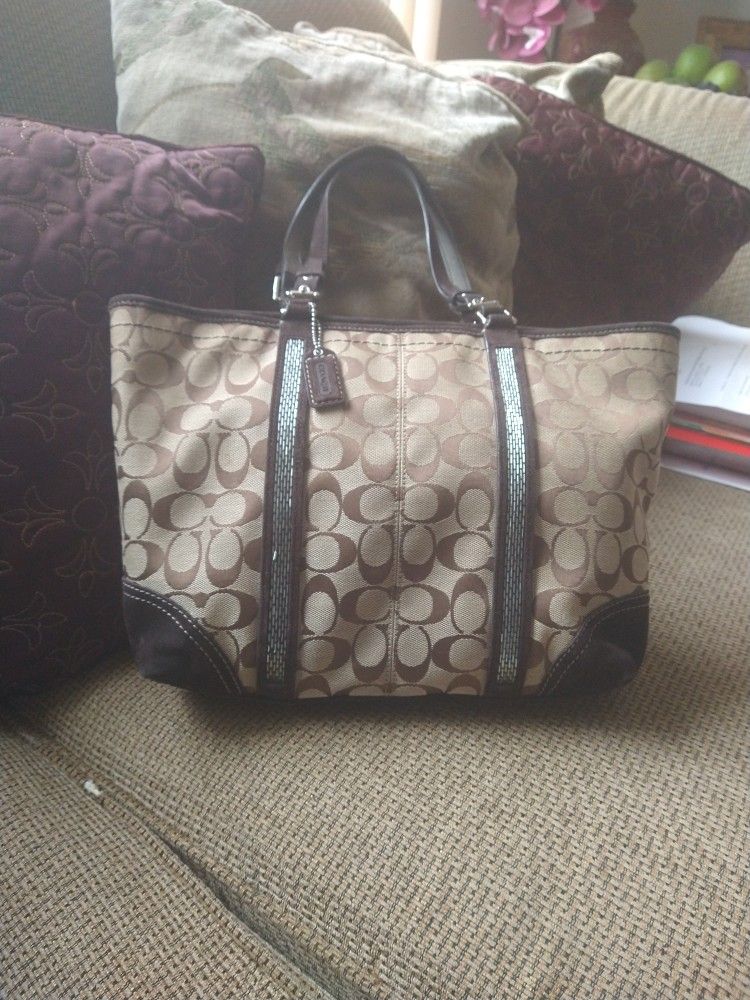 Coach Brown two tone signature shoulder tote purse.. item is pre lightly used but in excellent clean condition. Has been stored to preserve it's cleanliness. Coming from a pet-free smoke-free environment