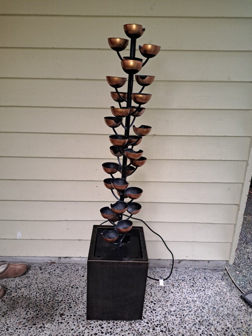 Stacked Cups Cascading Outdoor Garden Fountain. Stands approximately 6ft tall, pump works, but the little metal plate and the rocks are missing. Easy repair/replacement. A similar fountain that is only 37" sells online for over $300. Indulge in tranquility. This graceful fountain is a captivating centerpiece. Listen to the soothing rhythm of water cascading from cup to cup. Crafted for durability, the sturdy base supports the elegant tiers. Enhance your home or garden with this serene masterpiece. Product Features: Stacked cups outdoor garden fountain Solid foundation holds lofty cup tiers Metal is coated with zinc to prevent rusting Capture the calming sound of flowing water as it cascades Comes with a pump; adjustable flow rate Includes CSA/CUL approved adapter