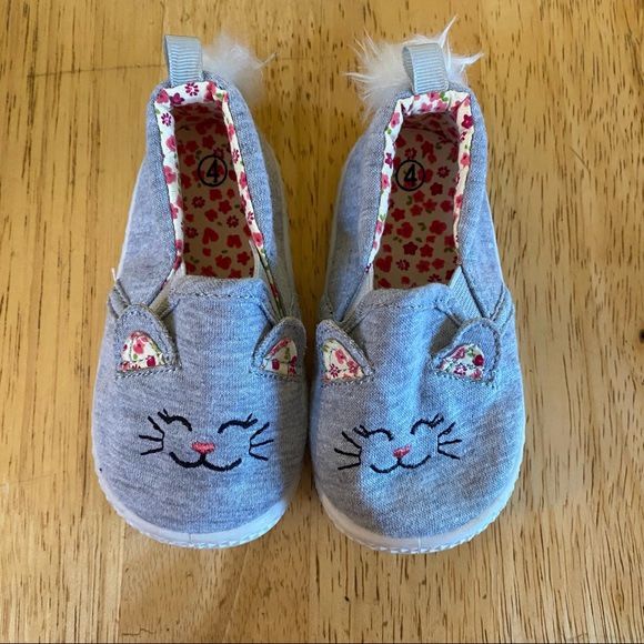 Adorable Gray Bunny Slip On Shoes Size 4 These shoes are SO cute. The are a Heather gray color with the cutest bunny face on the front. The back of the shoes have a white cotton tail for the bunny. Inside, a pretty pink flower pattern is inside. These are in great condition with very minor signs of wear and were likely worn only a few times. Size 4 SG Footwear Fabric Upper Balance Man Made Length 5.5in 451