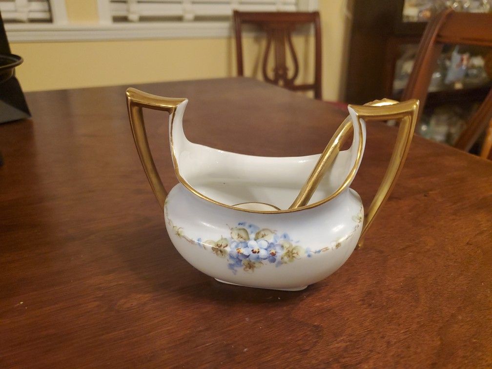 Vintage porcelain sugar bowl with spoon. Bowl reads "Favorite Bavaria", an export mark used for the US market by the C. Hutschenreuther Company of Bavaria around the early 1900s. Has lovely blue Forget-me -Not flowers and gold edging. Has a sweet spoon included. Thanks for looking.
