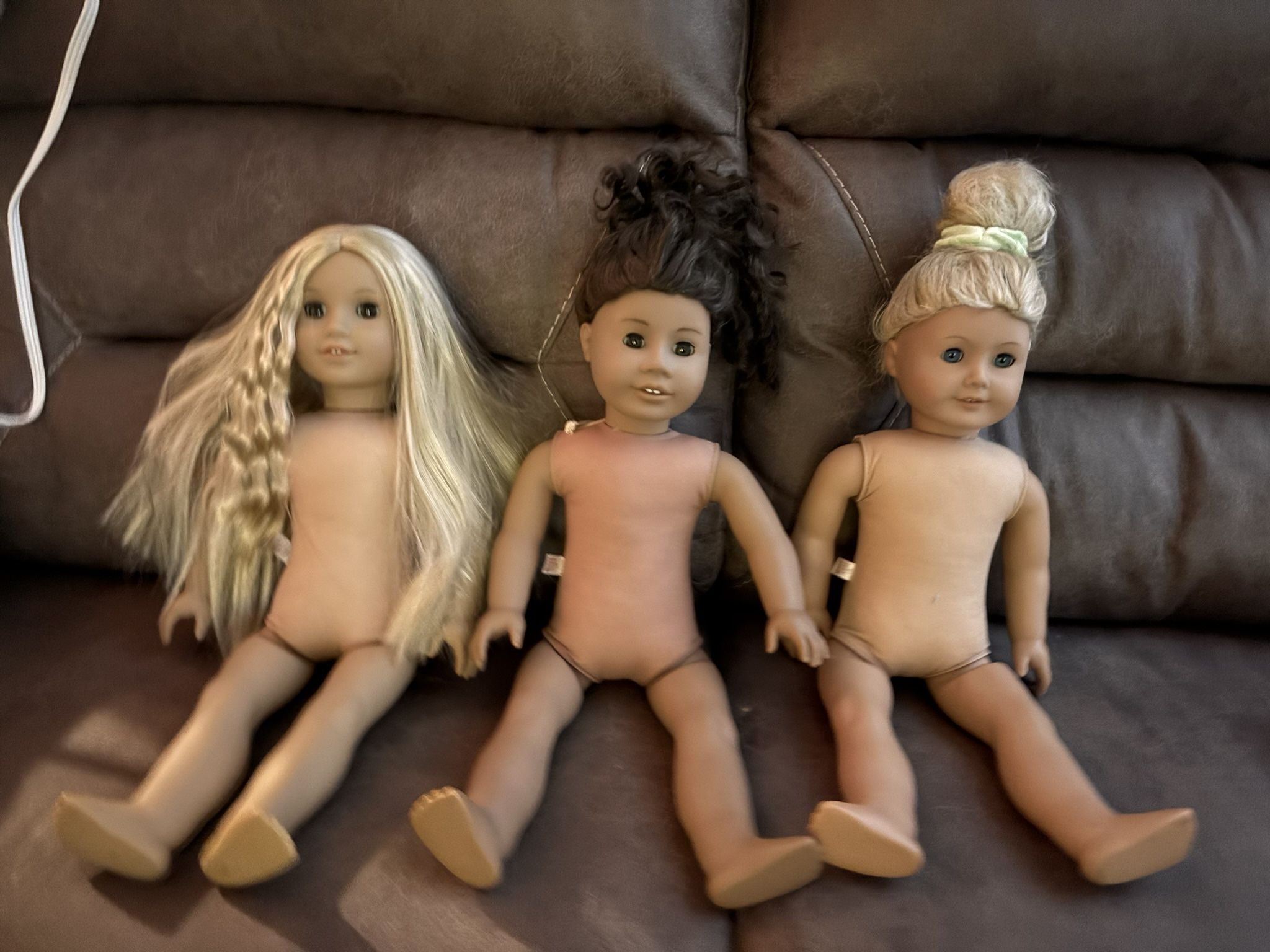 Used. American girl dolls. One with blonde hair and blue eyes, one with brown hair and brown eyes, one with blonde hair and brown eyes. Each will come with a pair of clothes