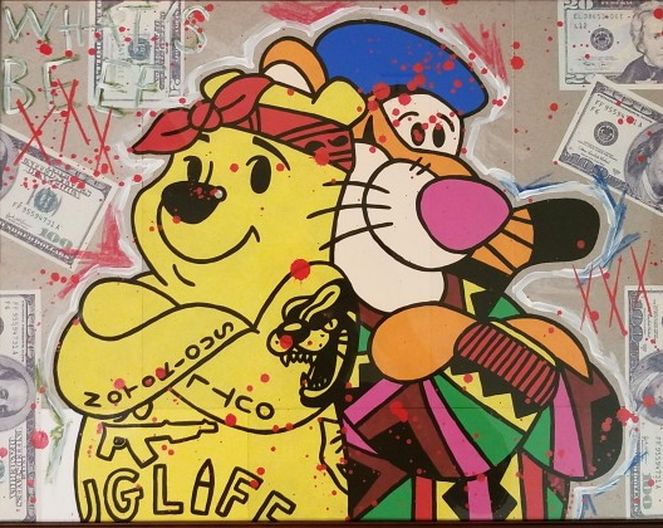 Local art by me. (14 × 18) - mixed media (acrylic, spray paint, money). A battle amongst best friends. Modern with a millennial feel.