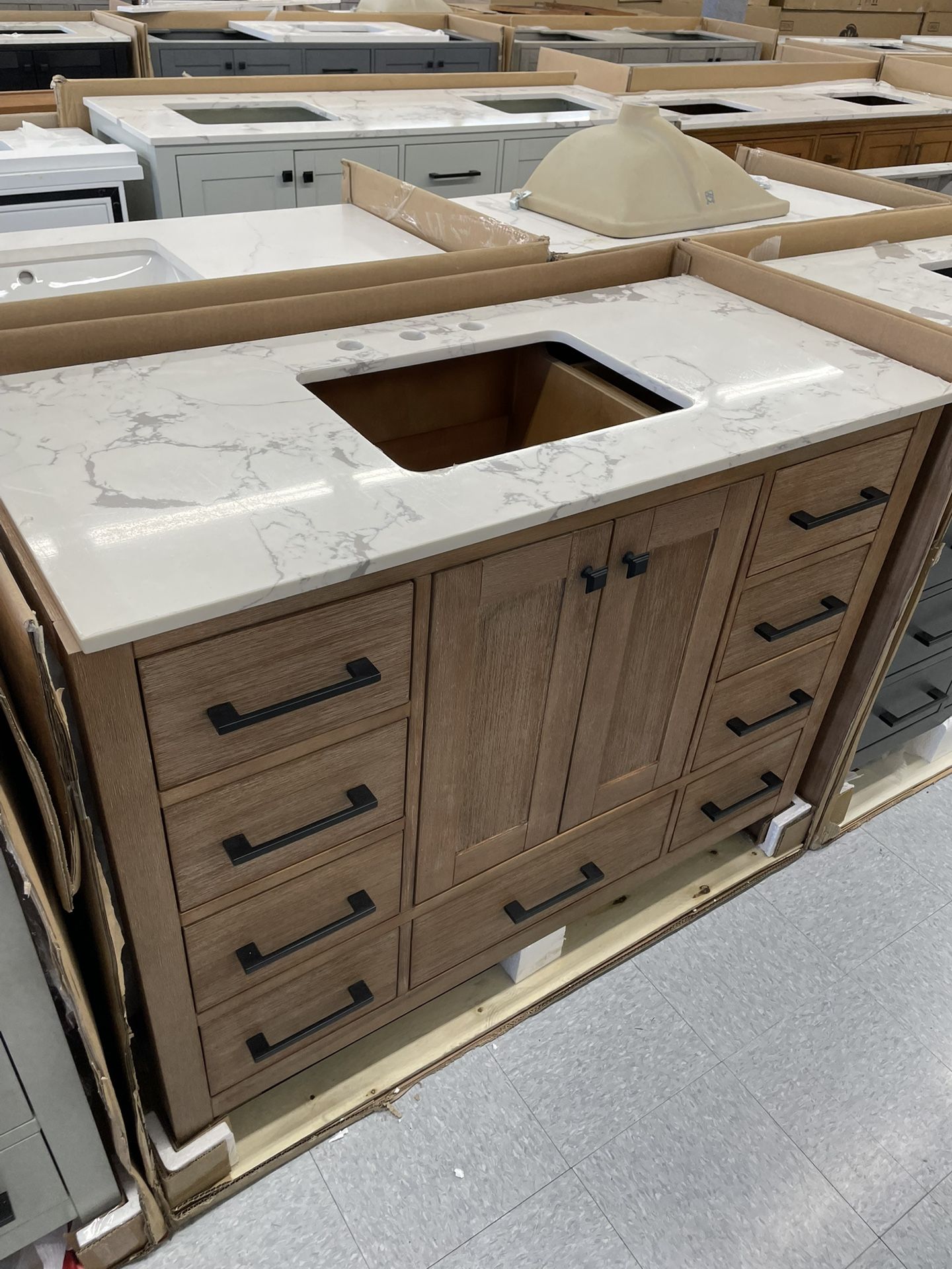 Bathroom vanity cabinet 48” full Teak Quartz top with sinks And Backsplash