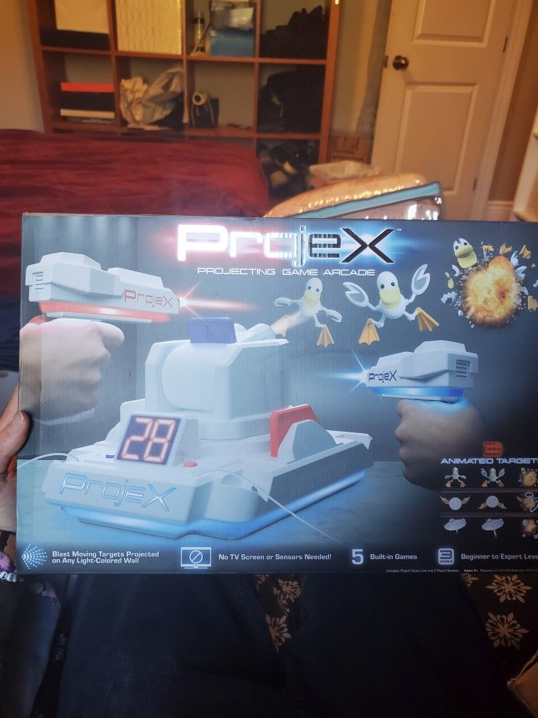 Selling New ProjeX Projecting Game Arcade. Blast animated images projected right on your wall – ducks, targets or UFOs, each with its own unique sound effects. 5 built-in games, 3 different skill levels – beginner, advanced and expert. Play solo, head-to-head or “co-op,” where players team up to get the highest combined score! Each blaster has an LED target pointer for accuracy. LED scoring display Works best in the dark, when images are projected on a light-colored wall with no artwork, wallpaper or painted patterns. Does not use laser. Beams are not visible. Simulated “laser” pointer is LED. Do not point blaster at eyes. Feel free to ask any questions!