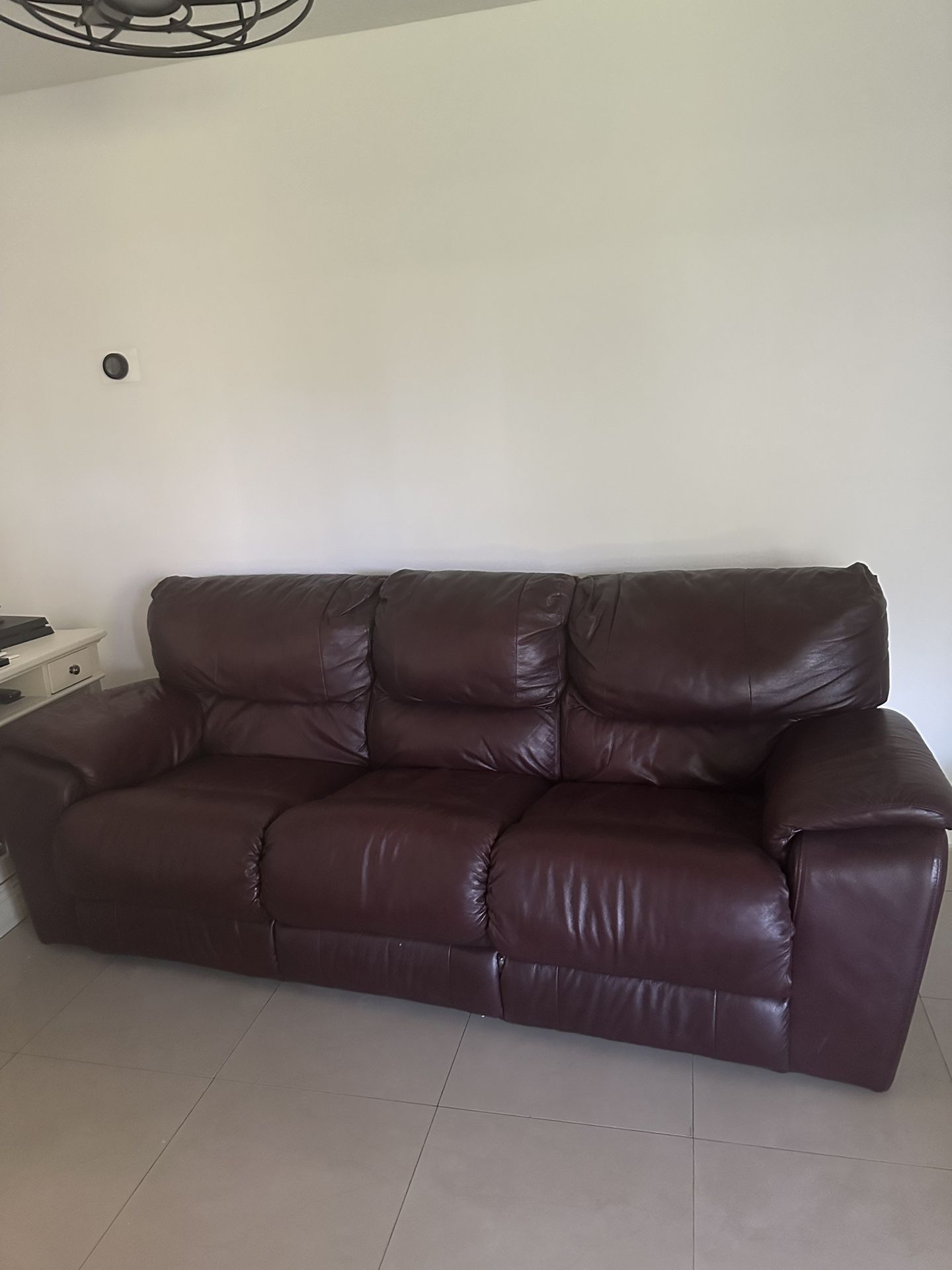 Burgandy red leather sofa.The two side seats manually recline. Has normal wear. Two corners on back of couch need leather paint (see picture) if it is not up against a wall. In very good condition. L 83” Depth30.5”