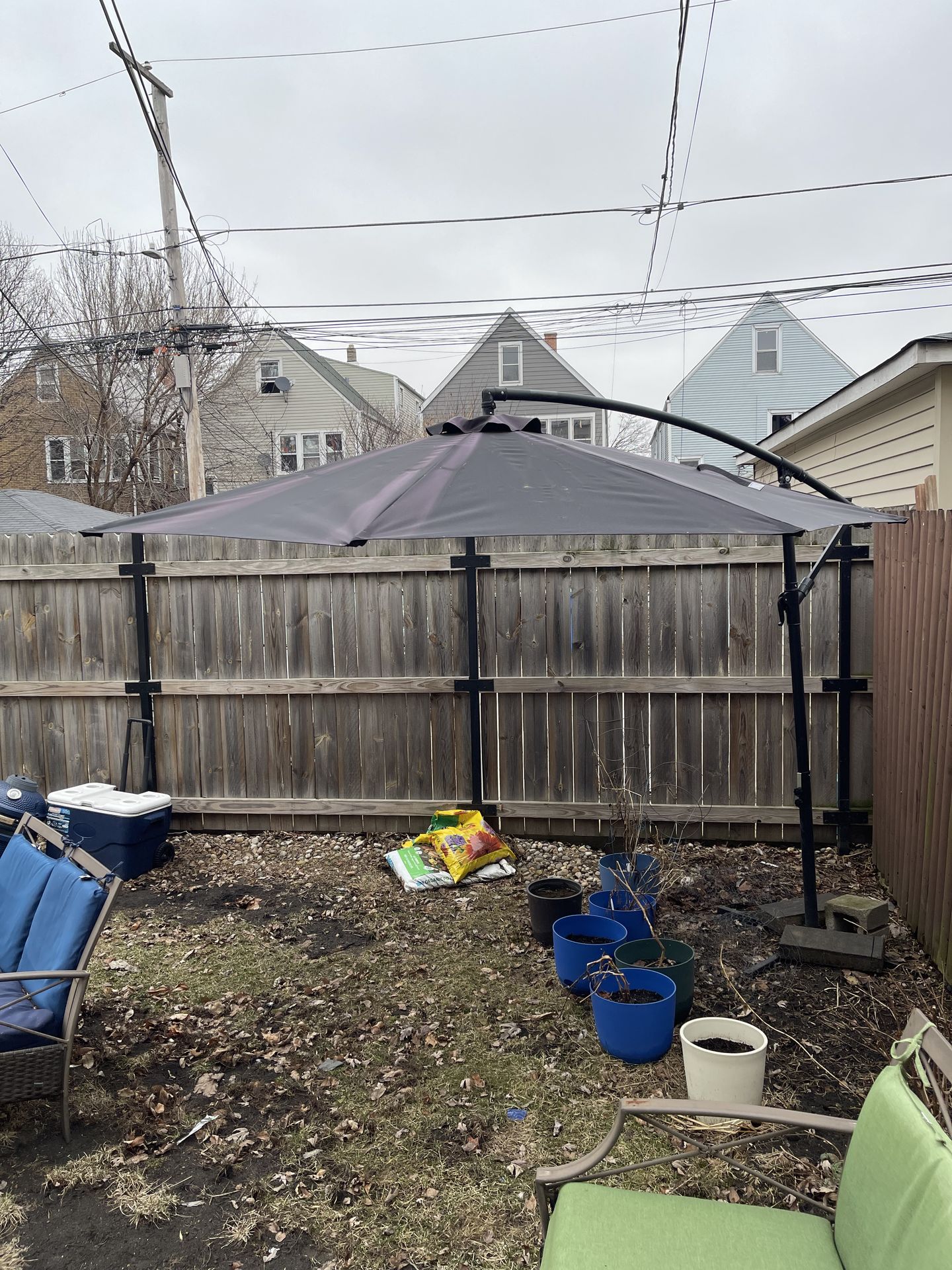 Large black outdoor umbrella. Great for shade or staying dry in the back yard, porch, or deck!