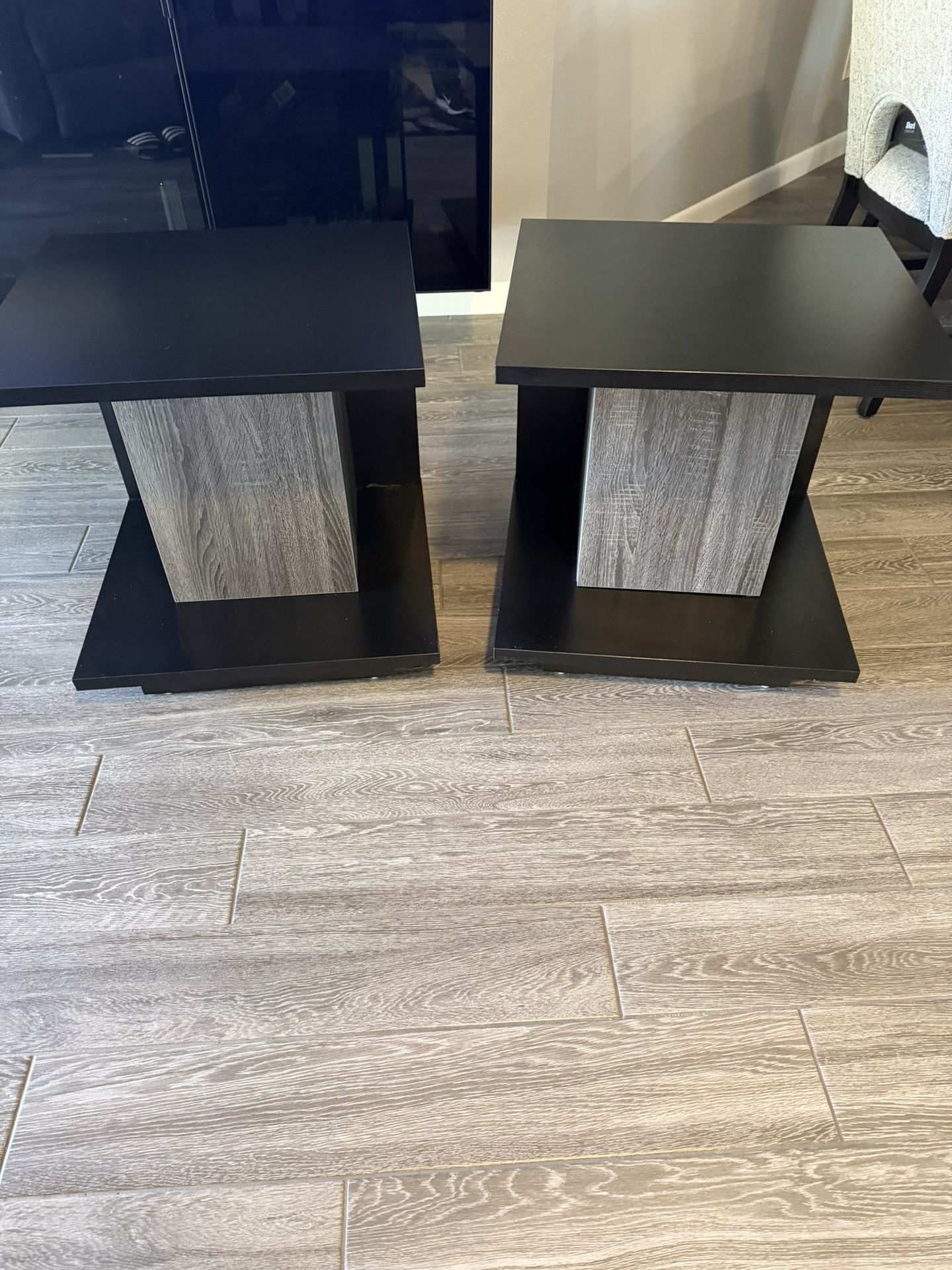 Set of 2 contemporary style, gray, and black end tables or nightstands with opening front doors for storage. Measurements are 22 inches wide, 20 inches long, 22 inches high tall. Located at Elliott and I-10 area. Cash only.