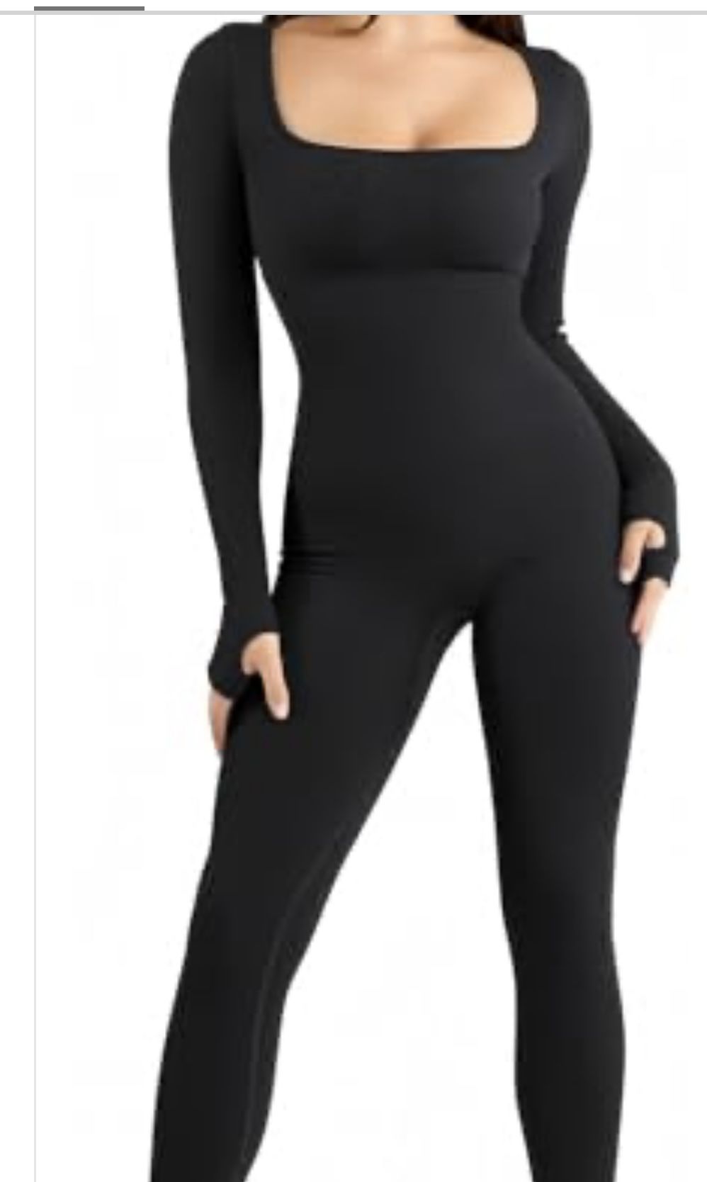 Popilush Jumpsuits For Women Long Sleeve Built-In Bra Square Neck Full Length Leggings Bodycon Stretch Workout Outfits $20new size M