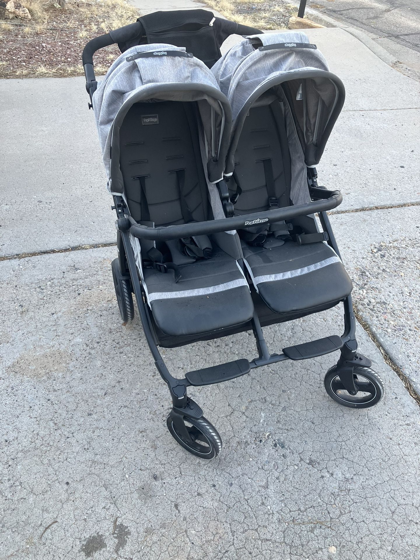 Peg Perego Book for Two twins stroller. Made in Italy. Retail new is $849. Black and Gray. Foldable. Great condition. Lightweight. Moves and swivels easily.