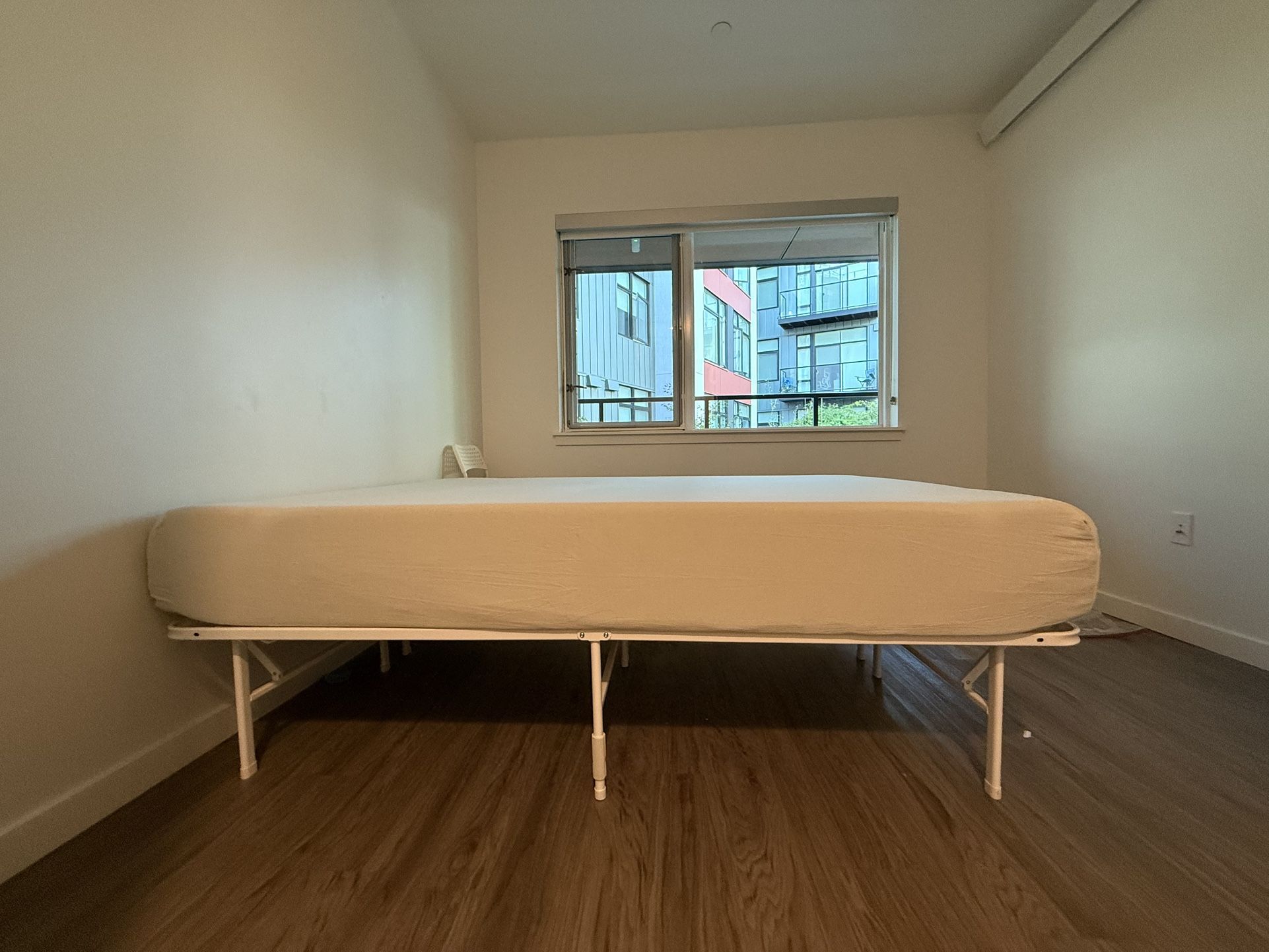 Zinus full-sized bed frame, no box spring needed. Purchased mid-April for temporary work assignment, used <6 months. No issues, must be picked up by Friday, 9/26.
