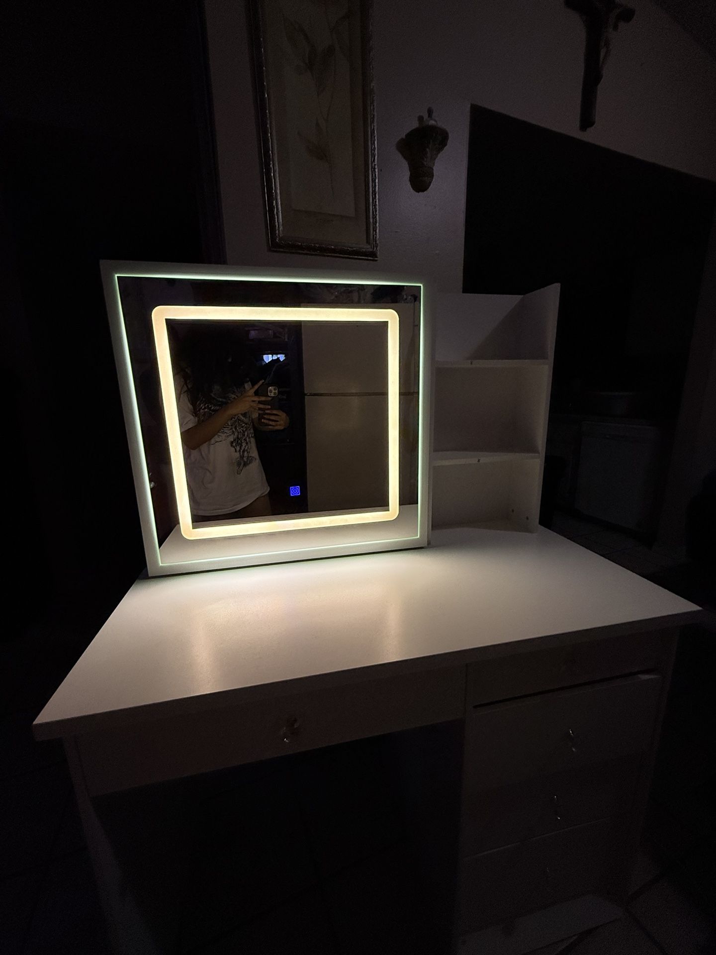 Everything is in good condition. The light works fine. The light comes in with 3 colors and the chair. I just want to get rid of it since I got myself a bigger vanity.