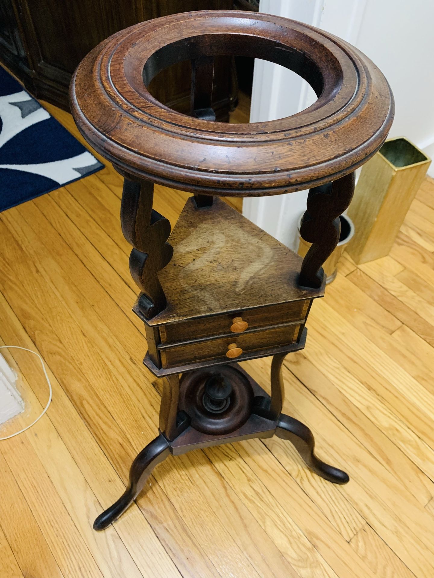 In-person, cash transaction only (no digital payments like Apple Pay, Venmo, Zelle, etc.) This Antique Georgian Mahogany Shaving Stand is in excellent condition. It features a circular top where the shaving bowl would be placed, which, in turn, is supported by three mahogany columnar support that resemble corbels. The piece features two drawers and is raised on shaped cabriole legs with pad feet. Dimensions Height: 32.5 inches Width: 21 inches Depth: 21 inches