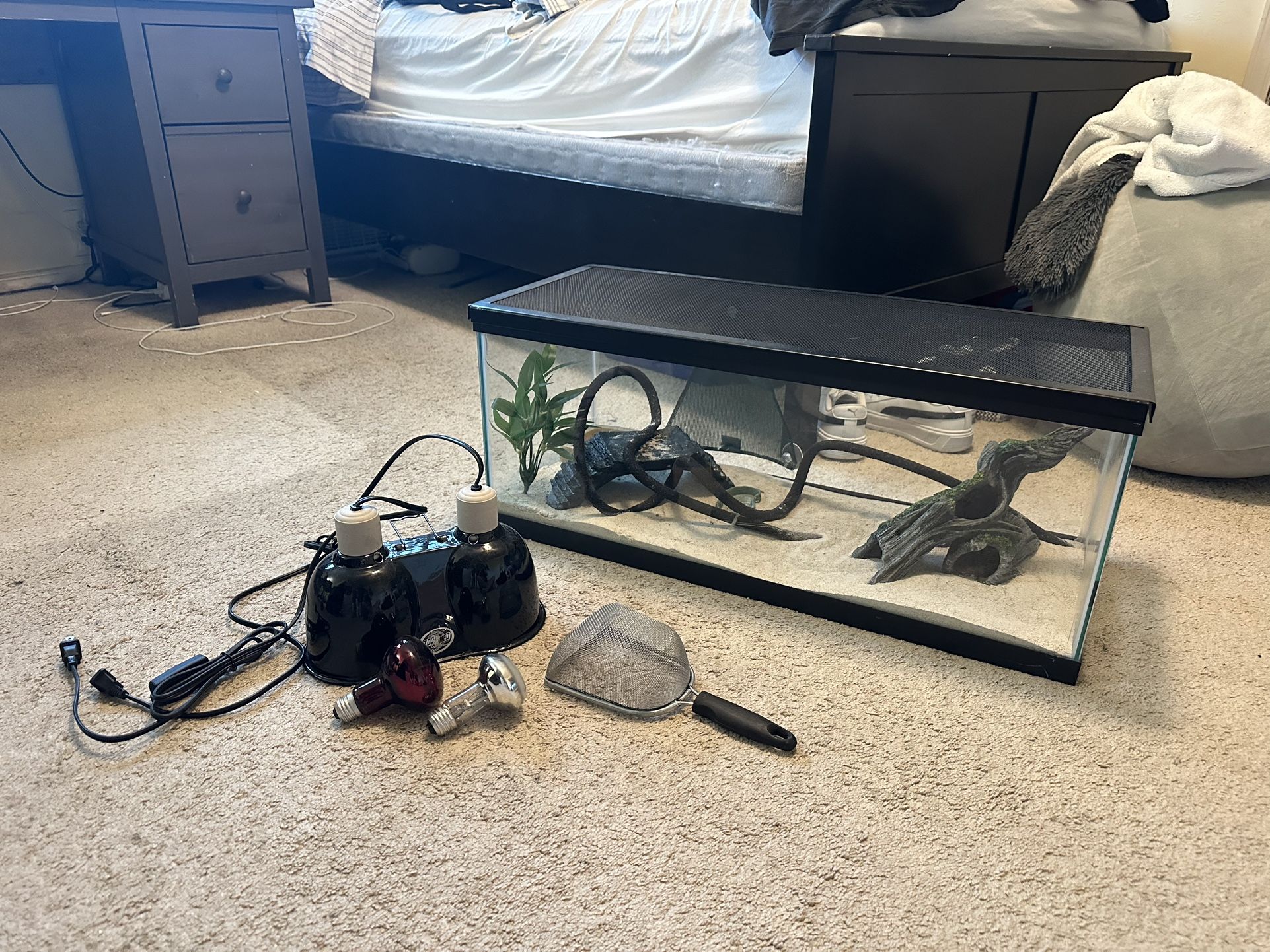 I have a 20 gallon fish tank that I used for a lizard, along with a double lamp fixture and a scoop. The lamp already has two lightbulbs in it, but I have two extra as well. The tank comes with accessories for enrichment. I’m open to offers, no lowballing please. Located in Pleasanton/Dublin, pickup or meetup only.