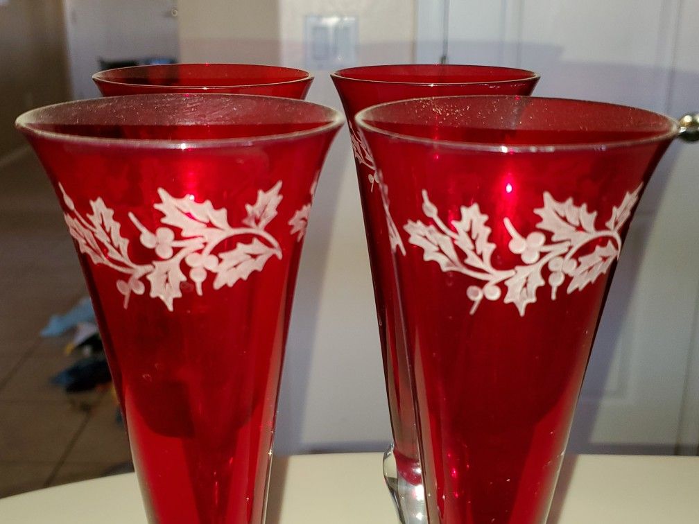 Set Of 4 - Christmas Holly Etched Red Glass Champagne Flutes/Glasses - $40 obo