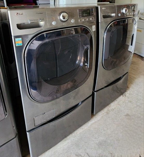 LG front load washer and electric dryer heavy duty super capacity both working great clean in n out energy star matching set with pedestals Hablo español