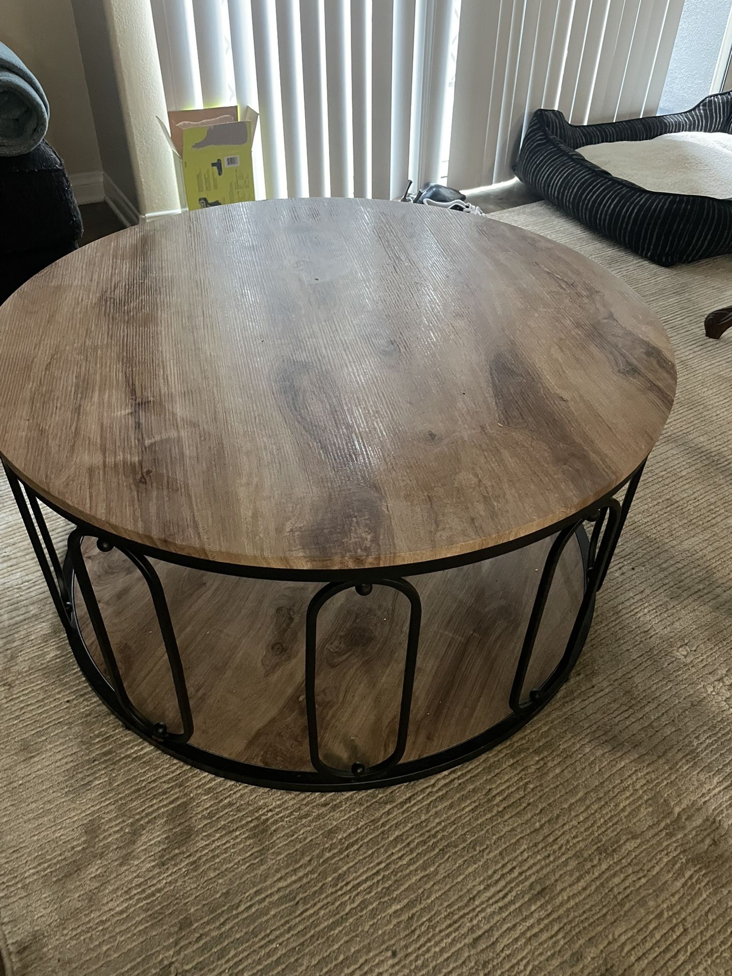35.5” diameter Selling this coffee table for $50! Originally $160. It’s in good condition and sturdy with some small ring marks in certain lighting and minor blemishes. The bottom panel pops out but nothing concerning once it’s stationary (we have an active dog and it’s never caused any issues)