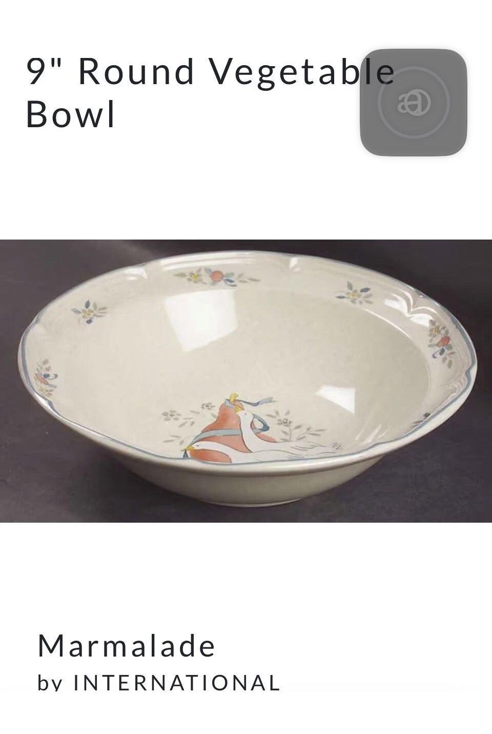 Width: 9 in Height: 2 1/2 in Crafted In China / Japan Microwave Safe, Dishwasher Safe, Oven Safe Discontinued Piece This vintage 9” vegetable bowl from International China Japan is perfect for any collector or lover of Marmalade-themed decor. Featuring adorable geese and a colorful design, this set is sure to add a touch of charm to any kitchen or dining room. Made of high-quality China, these dishes are both sturdy and beautiful. Whether you're serving up a dinner party or simply displaying them as decor, this bowl is a must-have. Listing separately in which set includes a variety of pieces, including platters, plates, and bowls, all featuring the same delightful design. With their multicolor palette and whimsical theme, these dishes are perfect for any occasion. So if you're looking for a unique and charming addition to your collection, look no further than this vintage Marmalade Geese set from International China Japan. Tennessee estate find International China Stoneware Shipping will have divided in different boxes This is also listed separately Marmalade Pattern GeeseCondition is Used. 1- 9” Serving Bowl This set would sale individually pieces over $680 Contact me if interested and want shipping Landrun Lane Arlington TX