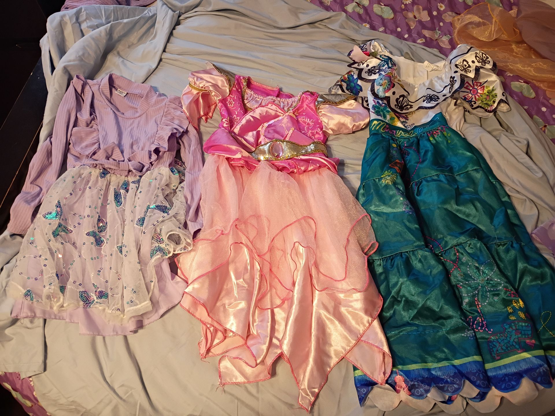 Encanto dress is "one size", others are 4/5. Great condition, the purple Isabella dress has some rips in the arms.