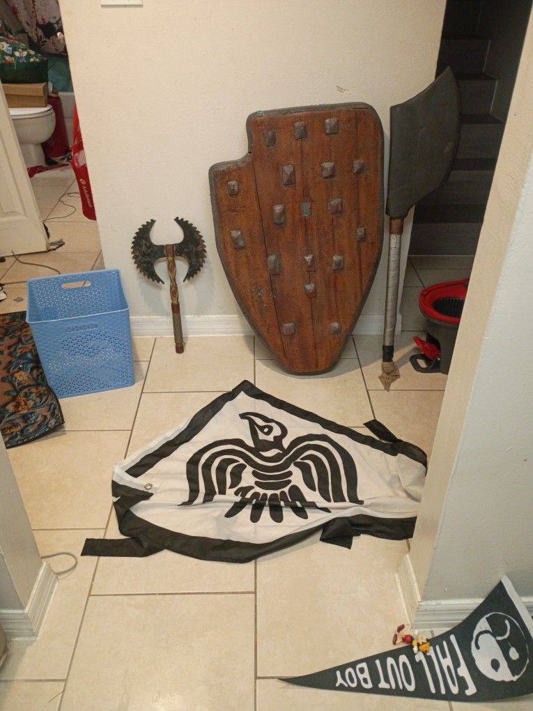 Comes with a shield and battle ax along with spear and a Vikings flying raven flag