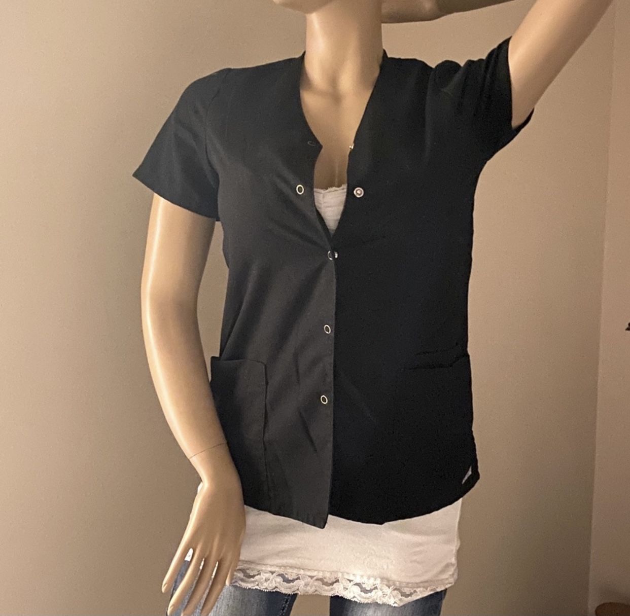 Black shirt sleeve scrub | work | medical | nurse | veterinary | nurse top | shirt. Features 3 front pockets. Pit to pit is 18” pit to hem is 17” size XS. By Grey’s Anatomy