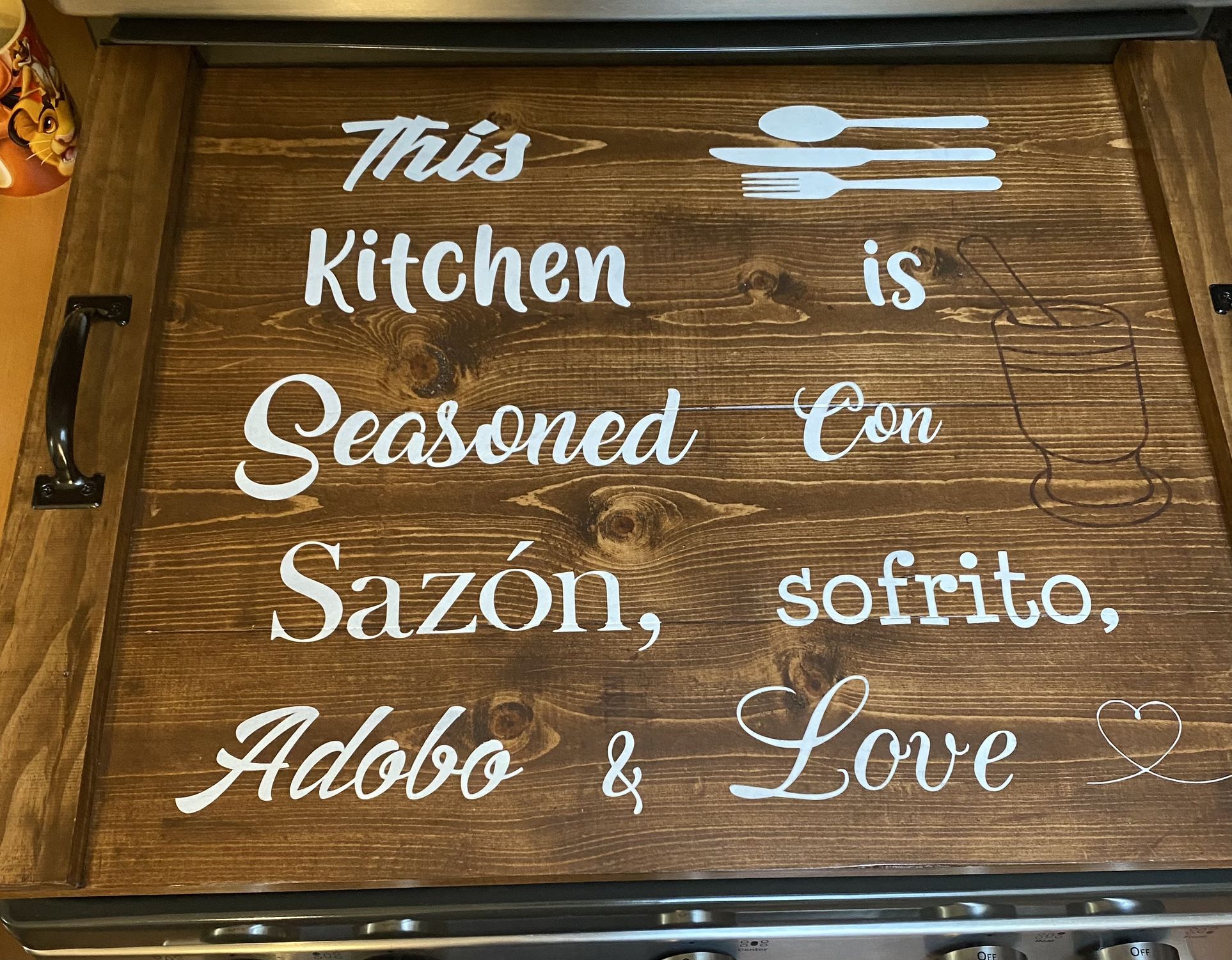 Hand made Stove top cover/noodle board not food safe, decorative use only. Do not leave on stove while on or warm. 30”x 22” Use for electric or gas ranges. On gas stove it sits on top of grates pickup at cvs by Dundee and old Buffalo grove